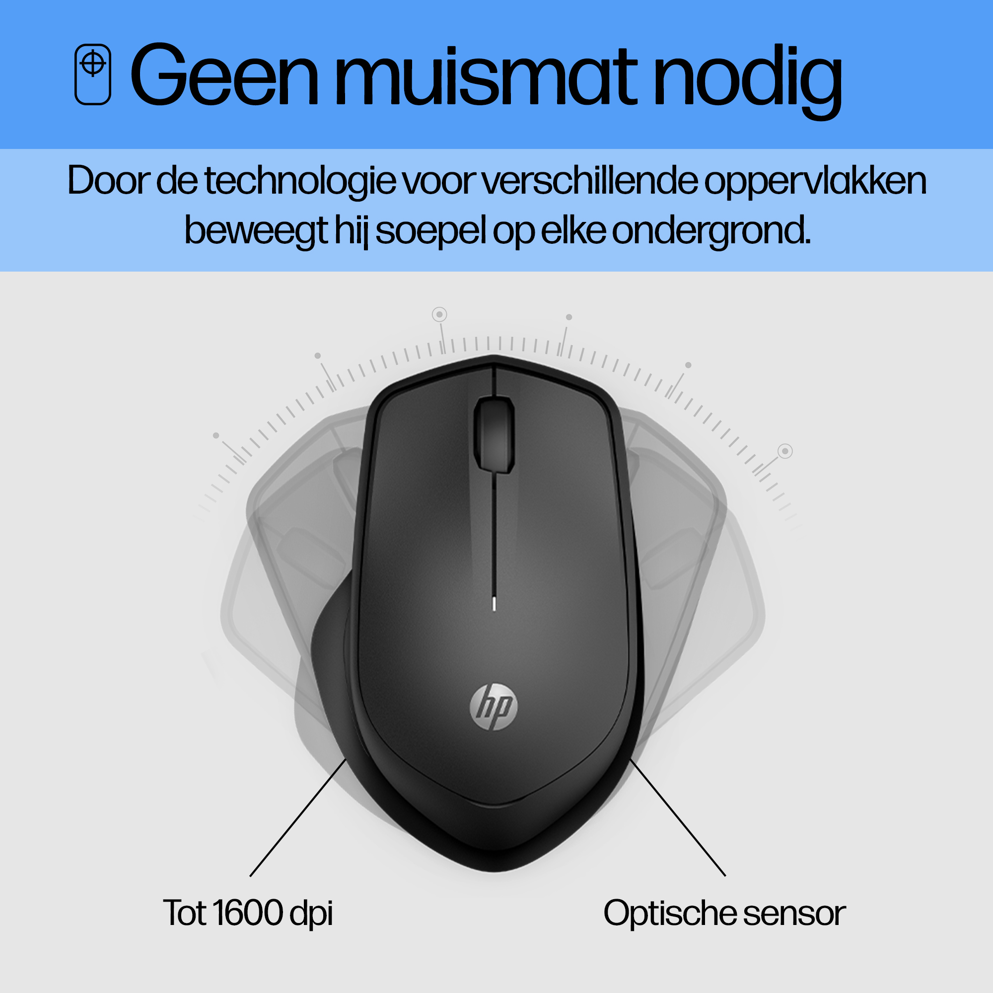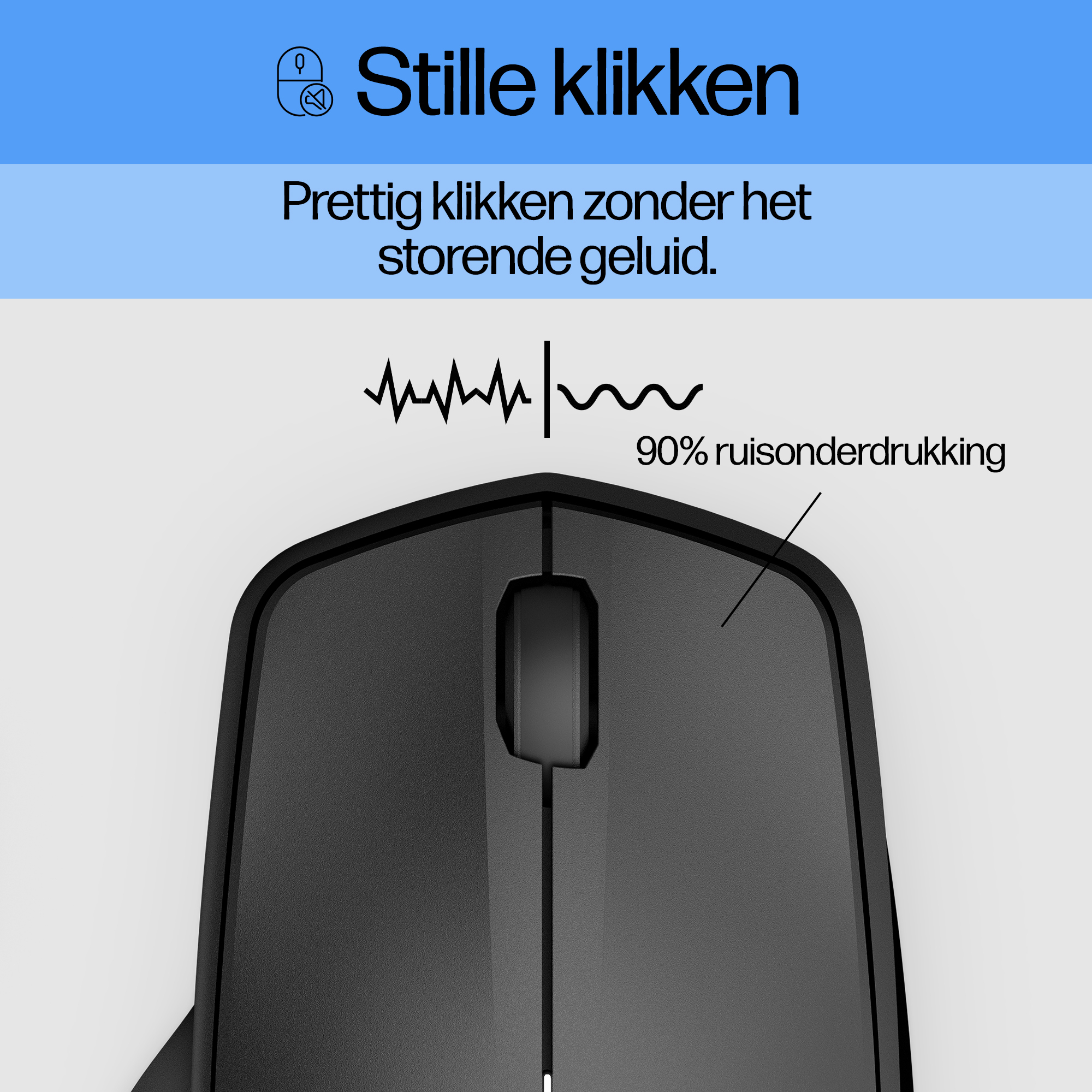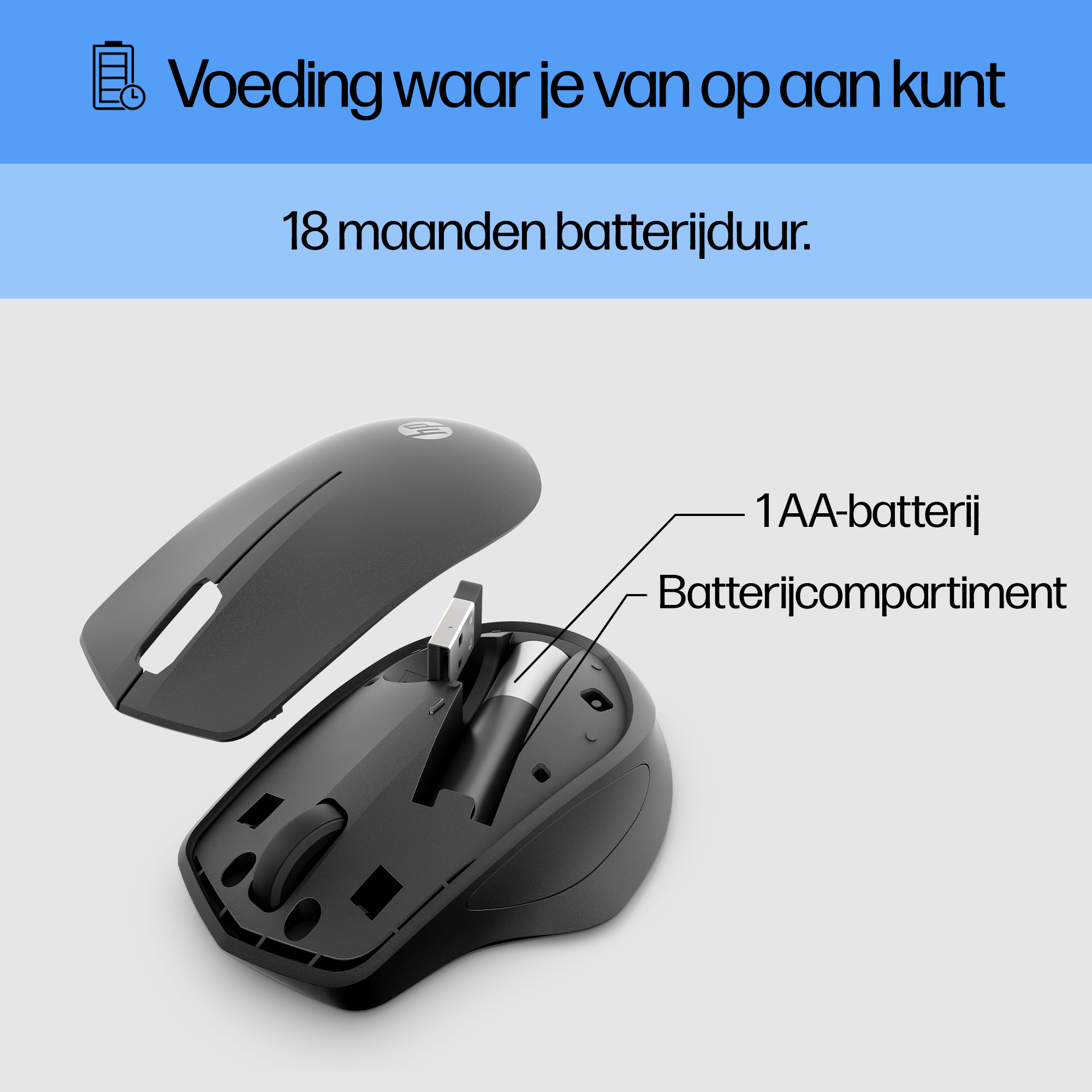 Werk de hele dag door, met deze draadloze muis die verbonden blijft. Laat niets je productiviteit verstoren met een comfortabel ergonomisch ontwerp en een batterijduur van tot 18 maanden[1]. En met een unieke stille klikfunctie kun je genieten van datzelfde klikgevoel zonder al het lawaai. En met HP Blue Optical Technology kun je op elk oppervlak werken, wanneer je maar wilt.