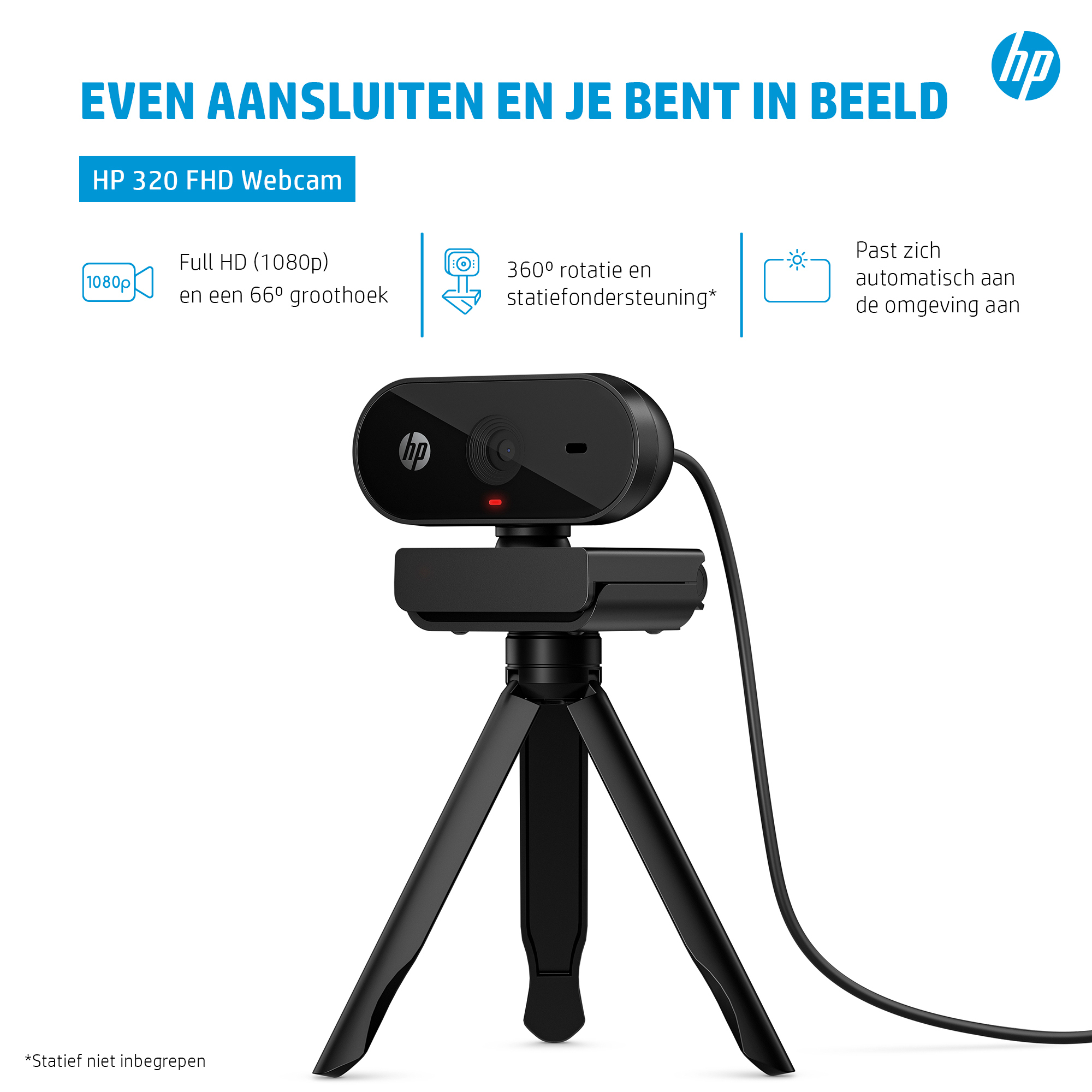Sluit de USB-A aan, klem de webcam erop, en hij past zich automatisch aan het licht om je heen aan. Gemakkelijk. Waar je ook gaat, hij past zich altijd aan je omgeving aan om je in beeld te houden.