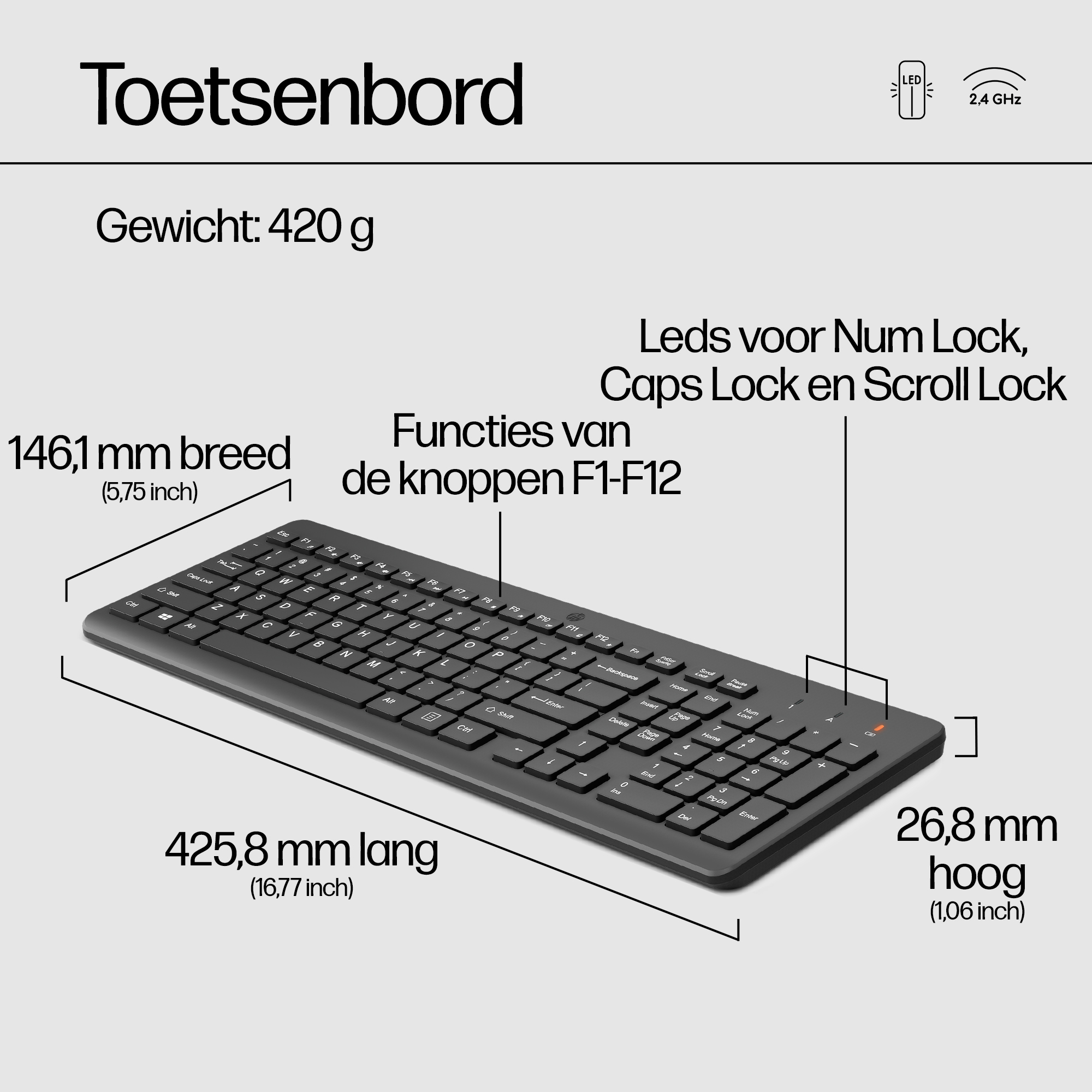 | Dimensies toetsenbord (BxDxH) | 425,8 x 146,1 x 26,8 mm |