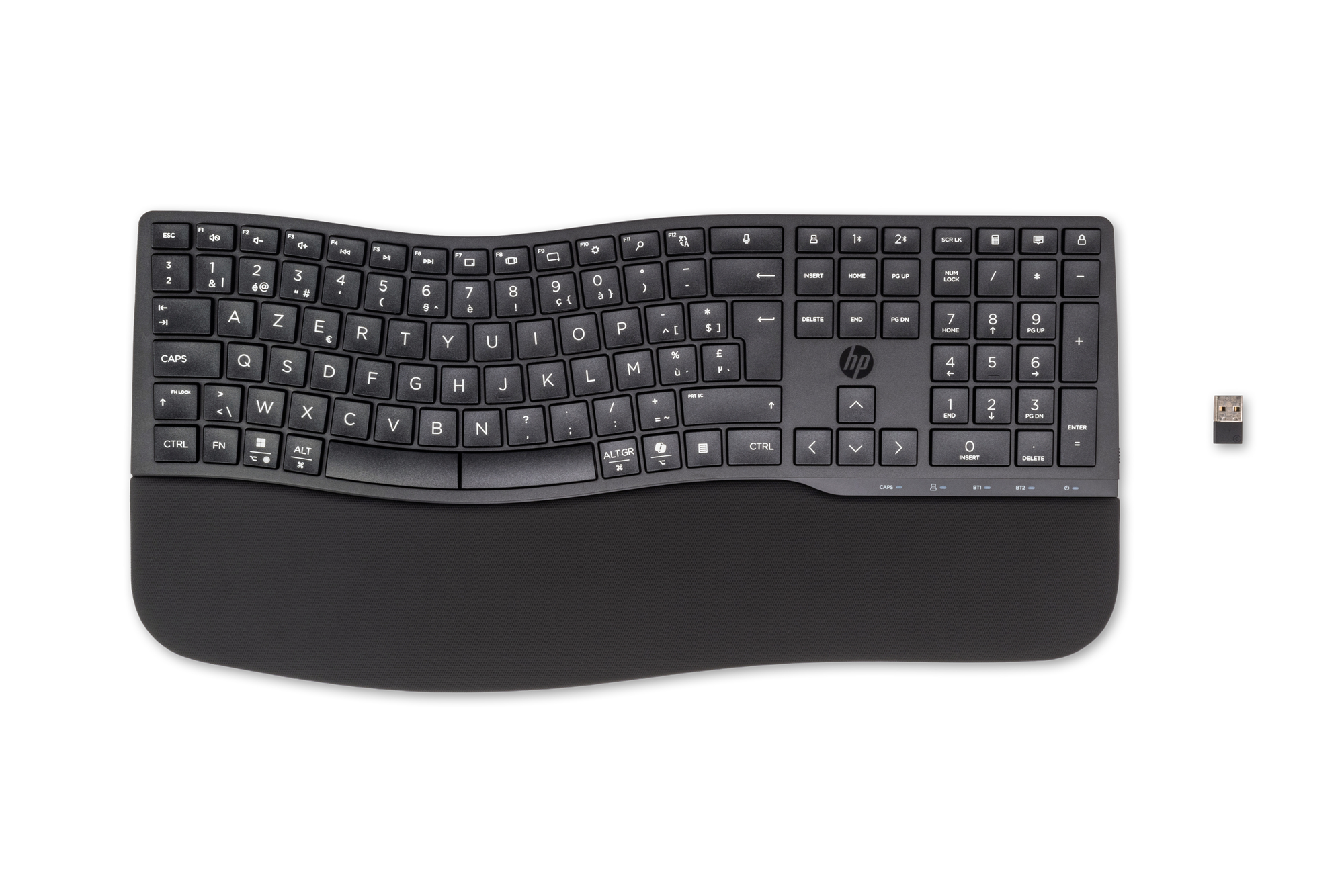 Heb je een toetsenbord nodig dat perfect bij je past? Het HP 680 Comfort Dual-Mode toetsenbord is precies wat je zoekt. Met instelbare typhoeken, programmeerbare toetsen[1] en veilige aansluitmogelijkheden biedt dit toetsenbord al het comfort, de personaliseerbaarheid en de compatibiliteit die je nodig hebt.