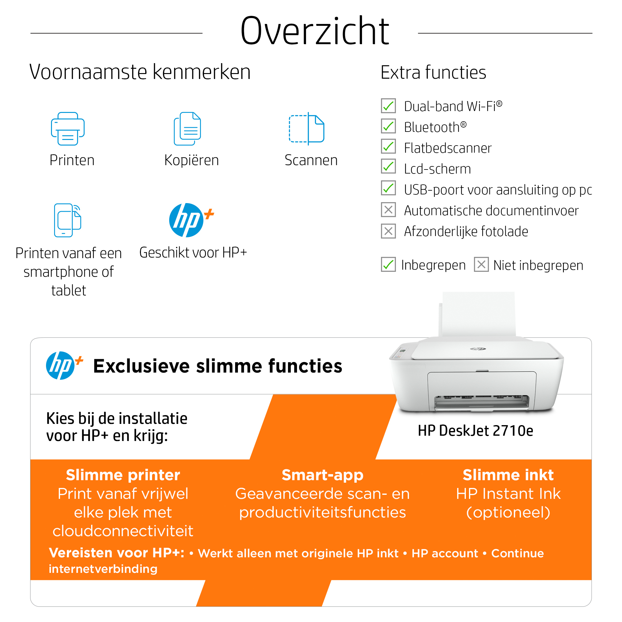 Dit is een printer die HP+ ondersteunt. Kies voor HP+ bij de installatie van het product om de voordelen te activeren. Voor HP+ is een HP account, continue verbinding met het internet en exclusief gebruik van originele HP inktcartridges tijdens de gehele levensduur van de printer vereist. Meer informatie op: http://www.hp.com/plus