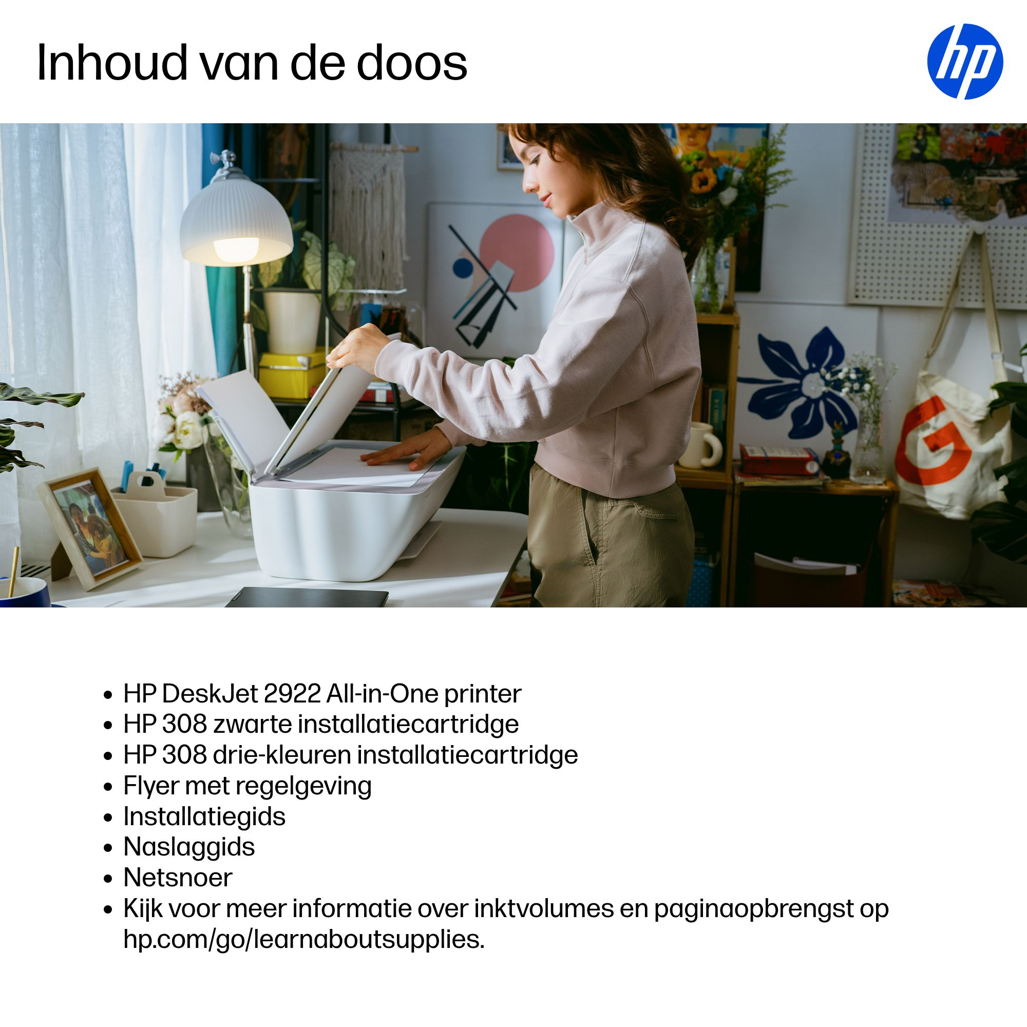 | Inhoud | HP DeskJet 2922 All-in-One printer; HP 308 zwarte installatiecartridge; HP 308 drie-kleuren installatiecartridge; Flyer met regelgeving; Installatiegids; Naslaggids; Netsnoer; Kijk voor meer informatie over inktvolumes en paginaopbrengst op hp.com/go/learnaboutsupplies. |