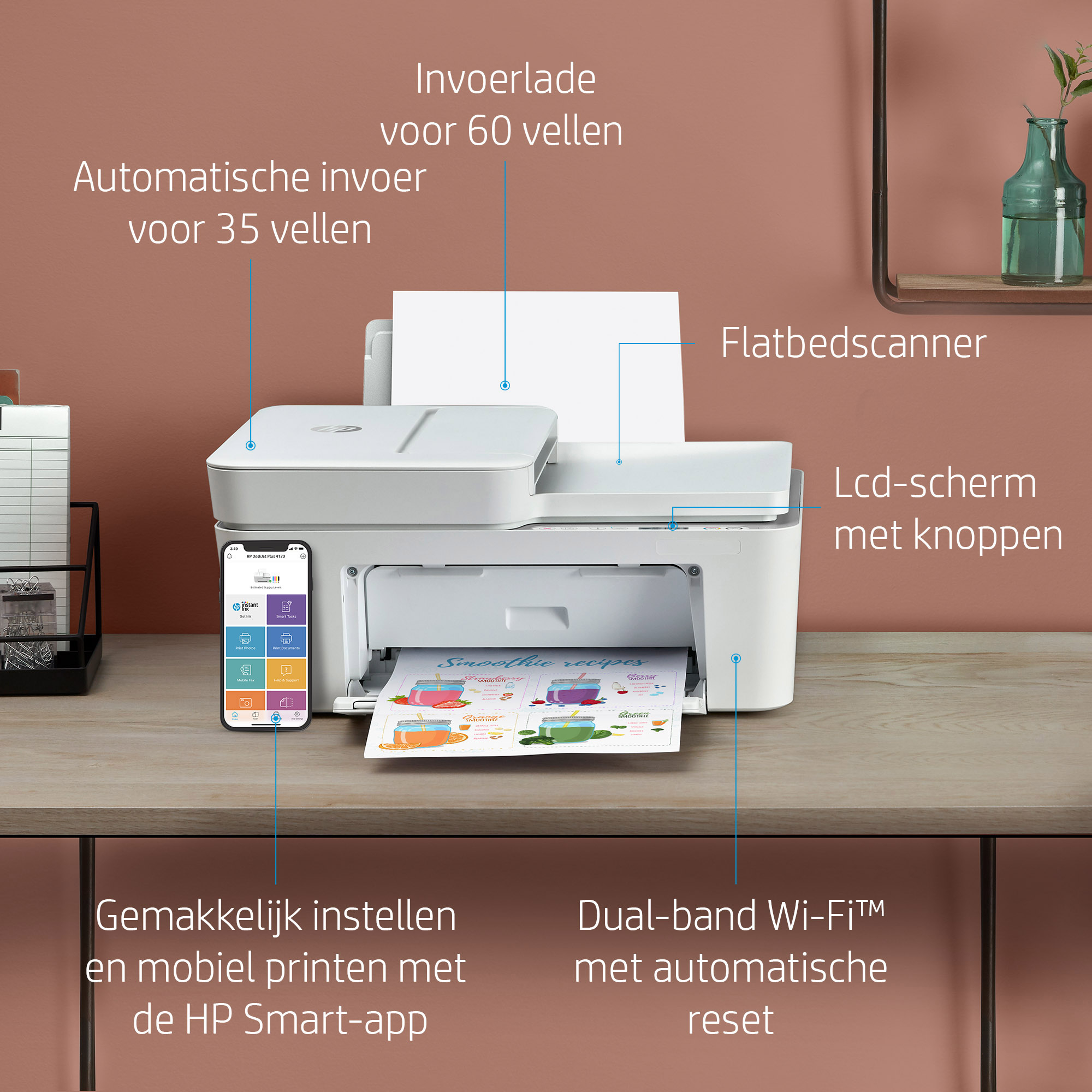 Print alledaagse documenten, scan en deel in hoge kwaliteit en maak eenvoudig kopieën – allemaal vanaf je telefoon met de HP Smart-app.<sup>[2]</sup>