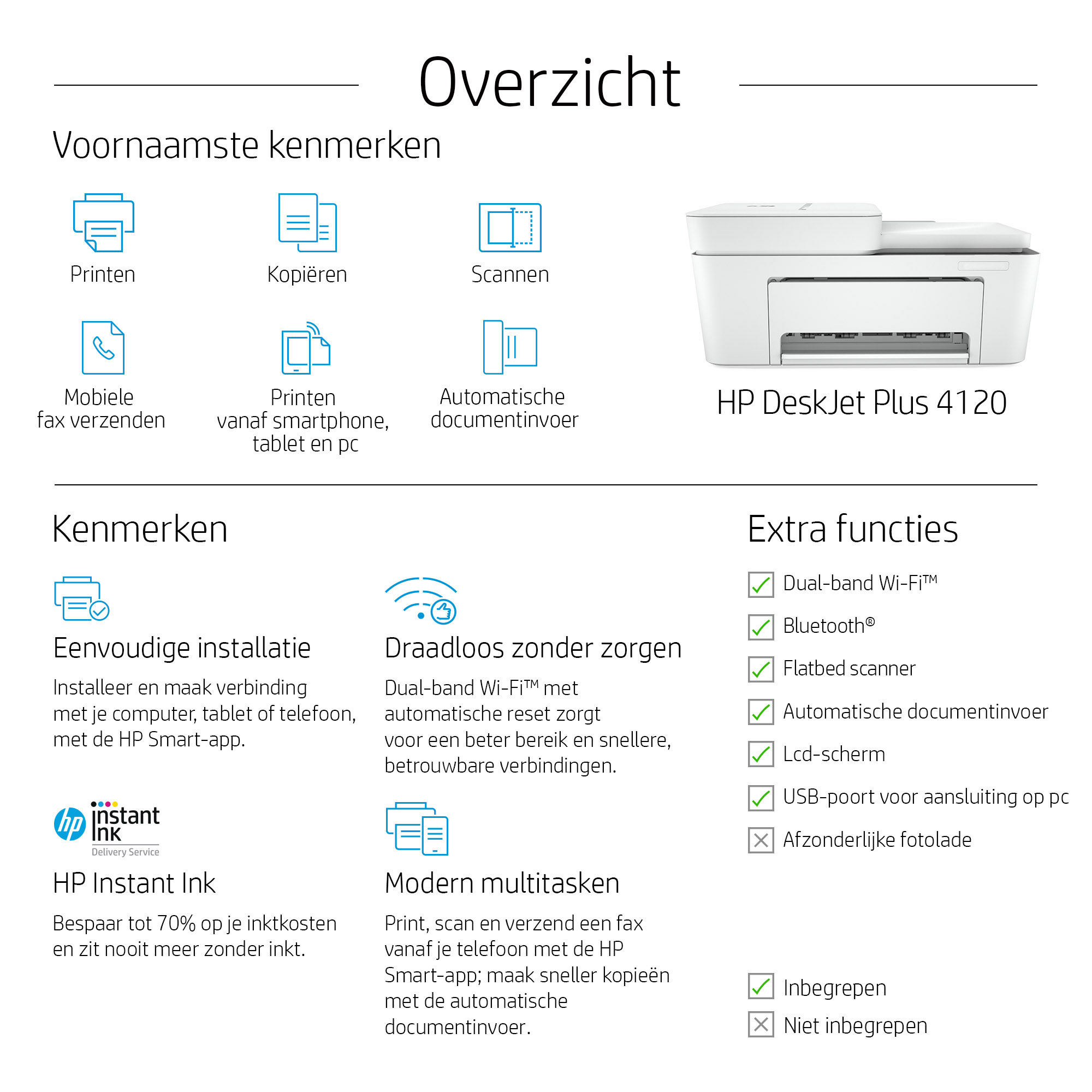 | Inhoud | HP DeskJet 4120 All-in-One printer; HP 305 zwarte setup-cartridge; HP 305 drie-kleuren setup-cartridge; Flyer met regelgeving; Installatiegids; Naslaggids; Netsnoer. Kijk voor meer informatie over inktvolumes en paginaopbrengst op http://www.hp.com/go/learnaboutsupplies. |