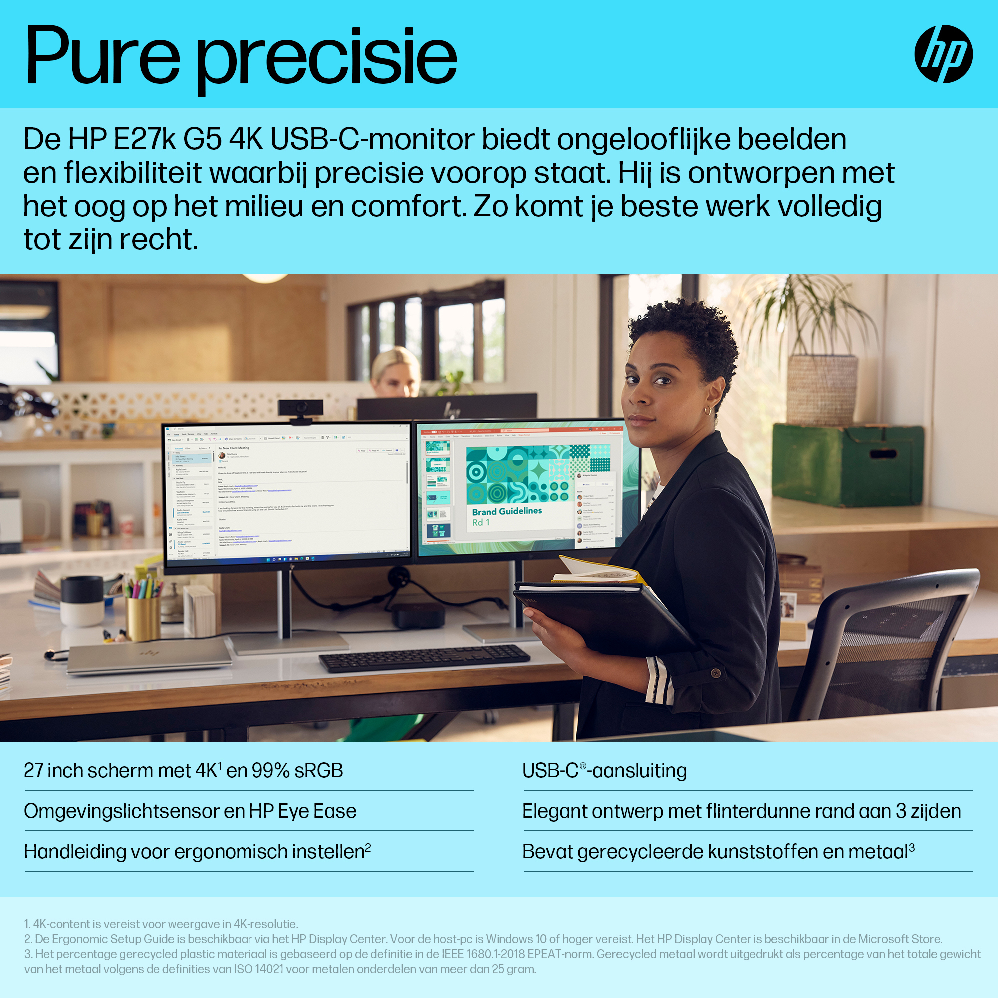 De HP E27k G5 4K USB-C-monitor heeft een uniek ontwerp voor ongelooflijke beelden en meer flexibiliteit en geeft een nieuwe invulling aan het begrip precisie. Er staat je dus niets meer in de weg om optimaal te presteren. Dit 4K-scherm is stijlvol vervaardigd met oog voor jouw comfort en het milieu, en is een productieve krachtpatser.