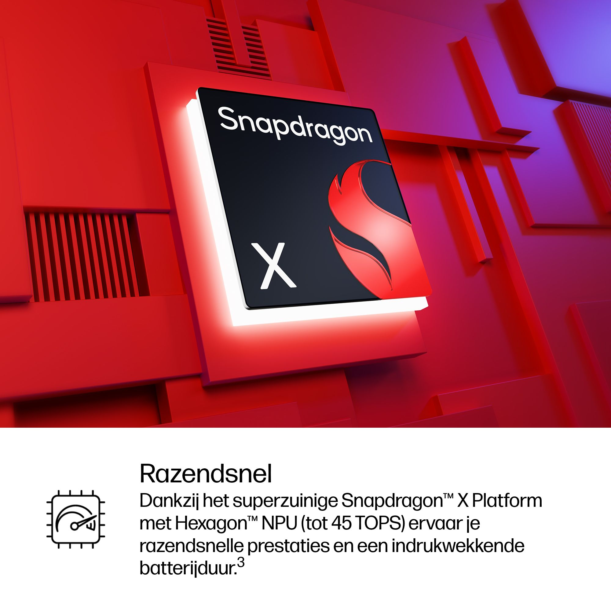 Deze dunne en elegante pc met het superzuinige Snapdragon™ X Plus-platform, een Hexagon™ NPU en Adreno™ GPU is razendsnel, heeft een optimale batterijduur en biedt al je vertrouwde Windows-applicaties en -functies.[6]