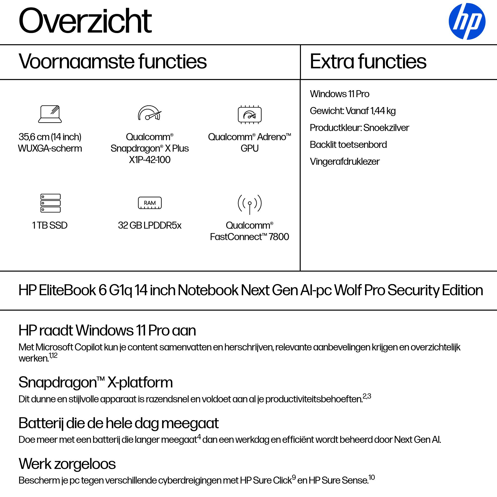 HP EB6G1q14AI X1P4210 14 32GB/1T PC NL Copilot+ PC Qualcomm Snapdragon X1P-42-100 Laptop 35,6 cm (14") WUXGA LPDDR5x-SDRAM 1 TB SSD Wi-Fi 7 (802.11be) Windows 11 Pro