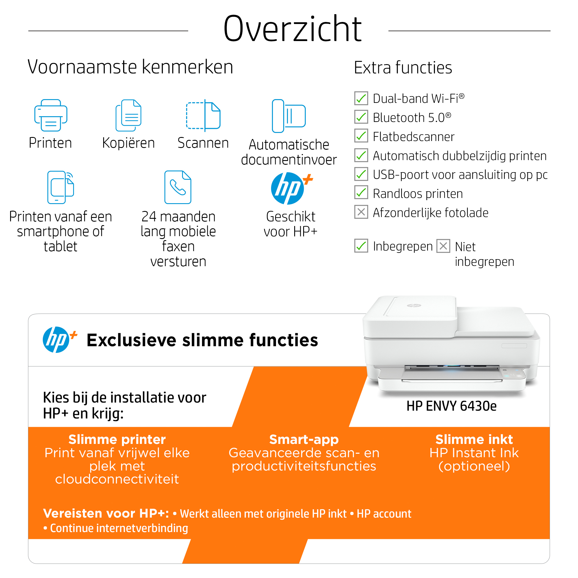 Dit is een printer die HP+ ondersteunt. Kies voor HP+ bij de installatie van het product om de voordelen te activeren. Voor HP+ is een HP account, continue verbinding met het internet en exclusief gebruik van originele HP inktcartridges tijdens de gehele levensduur van de printer vereist. Meer informatie op: http://www.hp.com/plus