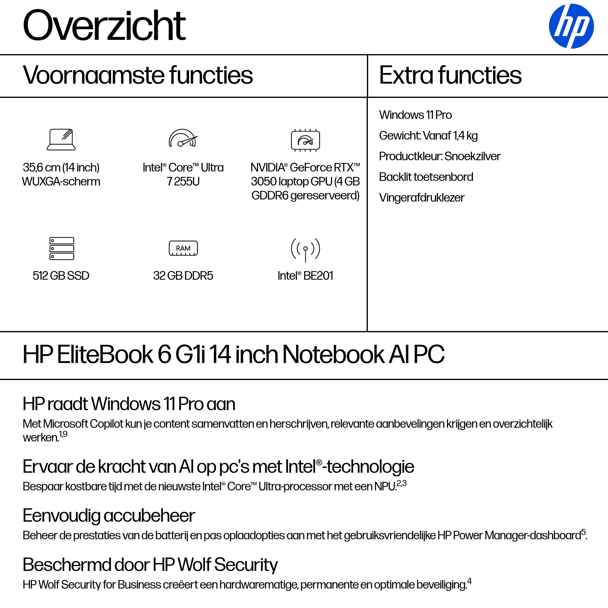 HP EliteBook 6 EB6G1i14 U7 255U 14 32GB/512 PC NL Intel Core Ultra 7 Laptop 35,6 cm (14") WUXGA DDR5-SDRAM 512 GB SSD Wi-Fi 7 (802.11be) Windows 11 Pro AI PC Zilver