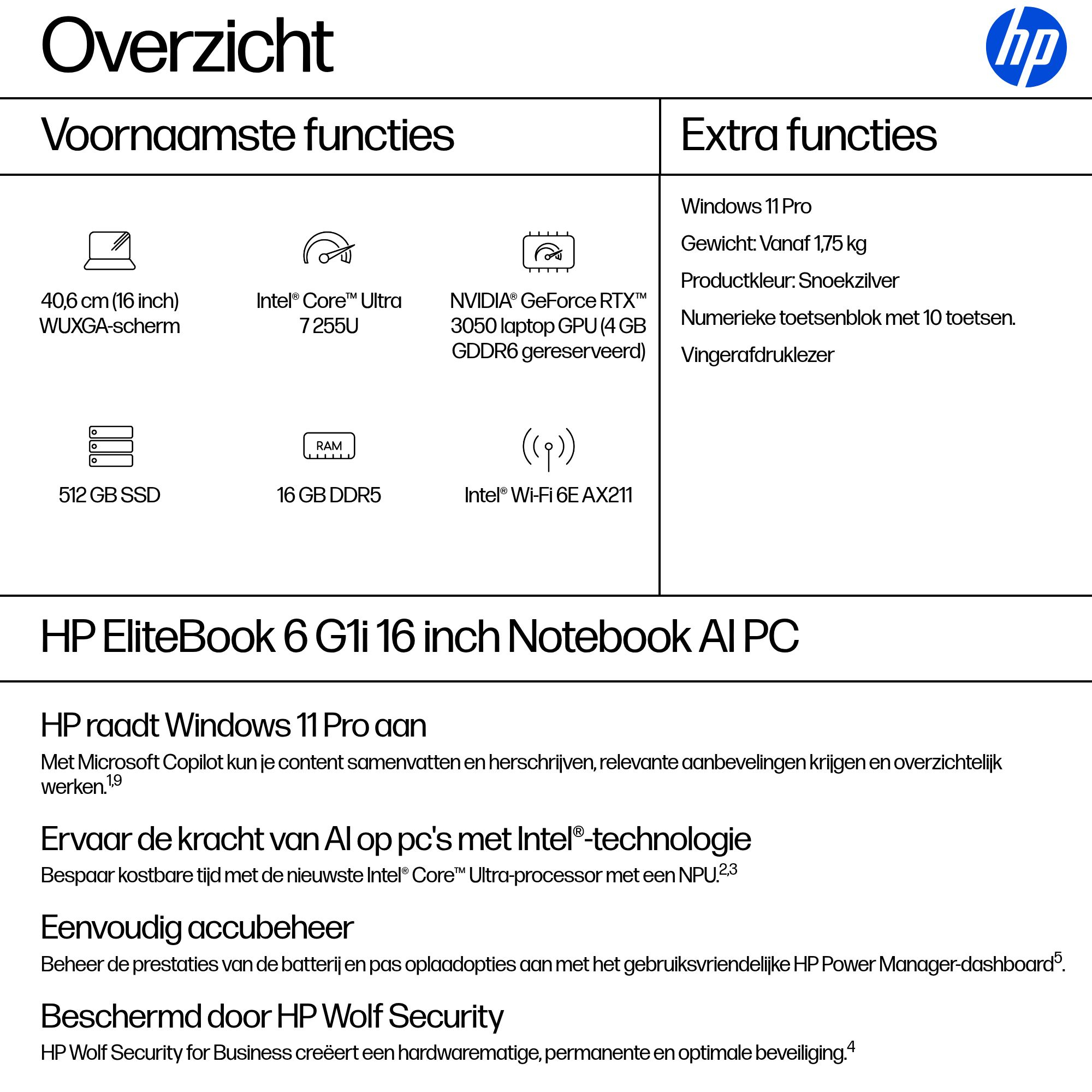 HP EliteBook 6 G1i AI Intel Core Ultra 7 255U Laptop 40,6 cm (16") WUXGA 16 GB DDR5-SDRAM 512 GB SSD Wi-Fi 6E (802.11ax) Windows 11 Pro AI PC Zilver