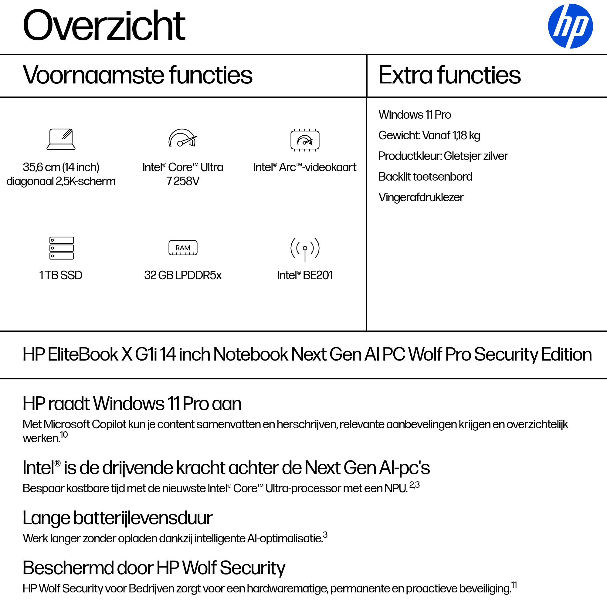 HP EliteBook X EBXG1i14AI U7 258V 14 32GB/1T PC NL Copilot+ PC Intel Core Ultra 7 Laptop 35,6 cm (14") 2.5K LPDDR5x-SDRAM 1 TB SSD Wi-Fi 7 (802.11be) Windows 11 Pro Zilver