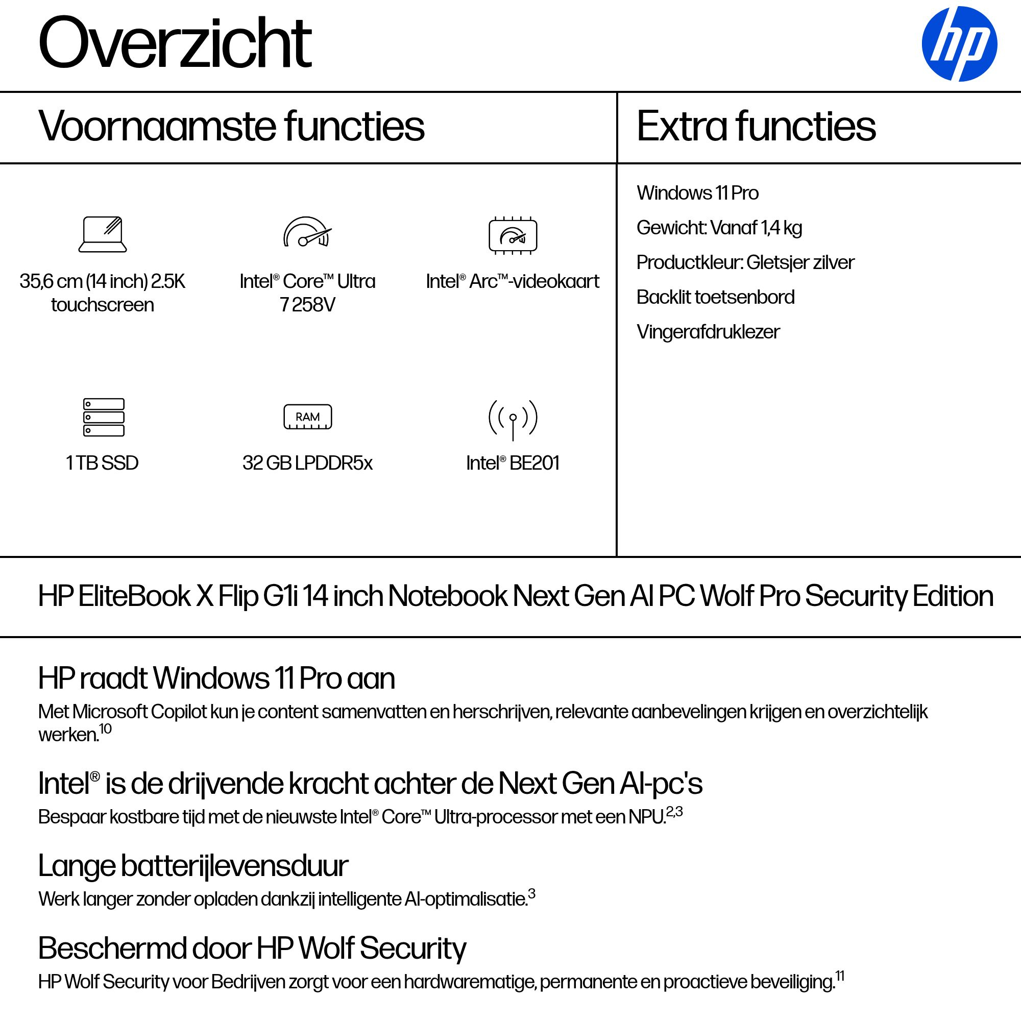 HP EliteBook X Flip EBXFlG1i14AI U7 258V 14 32GB/1T PC NL Copilot+ PC Intel Core Ultra 7 Hybride (2-in-1) 35,6 cm (14") Touchscreen 2.5K LPDDR5x-SDRAM 1 TB SSD Wi-Fi 7 (802.11be) Windows 11 Pro Zilver