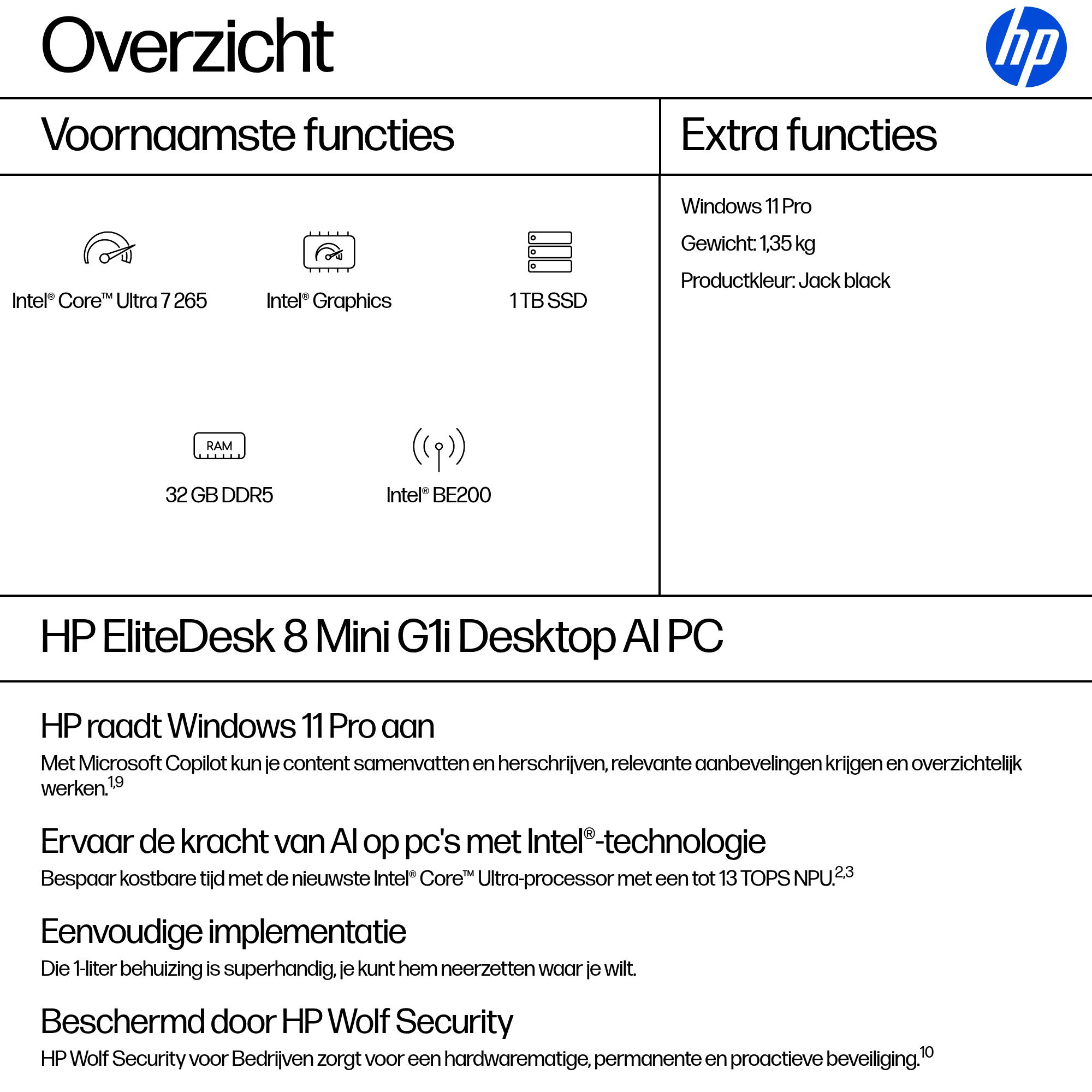 HP EliteDesk 8 Mini G1i U7265 32GB/1TBPC Intel Core Ultra 7 265 DDR5-SDRAM 1 TB SSD Windows 11 Pro Mini PC AI PC Zwart