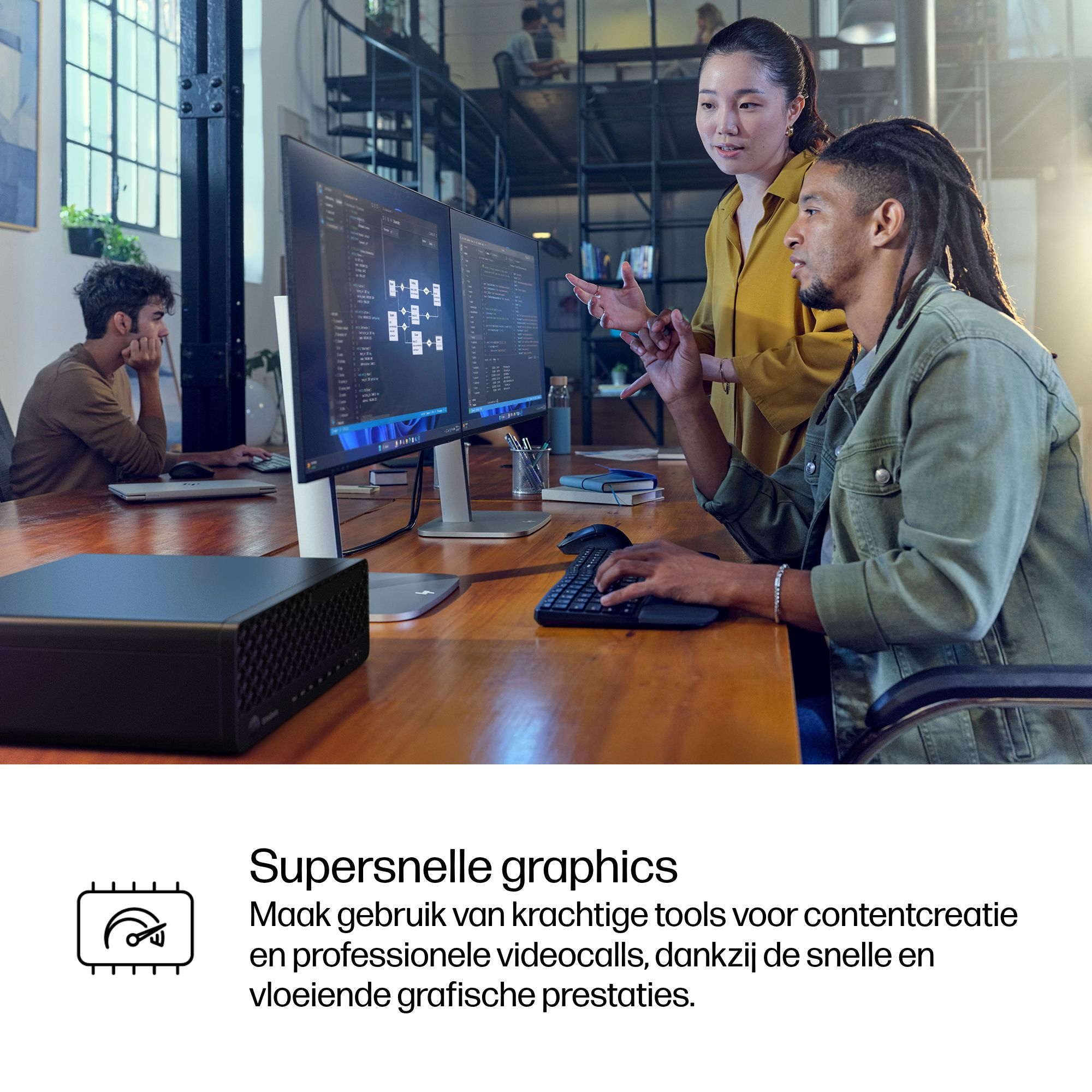 Ervaar de kracht van de HP EliteDesk 8 SFF G1i AI-pc die ideaal is voor kleine werkruimtes. Deze veilige, schaalbare en krachtige AI-pc is voorzien van de nieuwste Intel Core™ Ultra-processor[2] met een 13 TOPS NPU[3] en voorziet in al je multitaskingbehoeften.