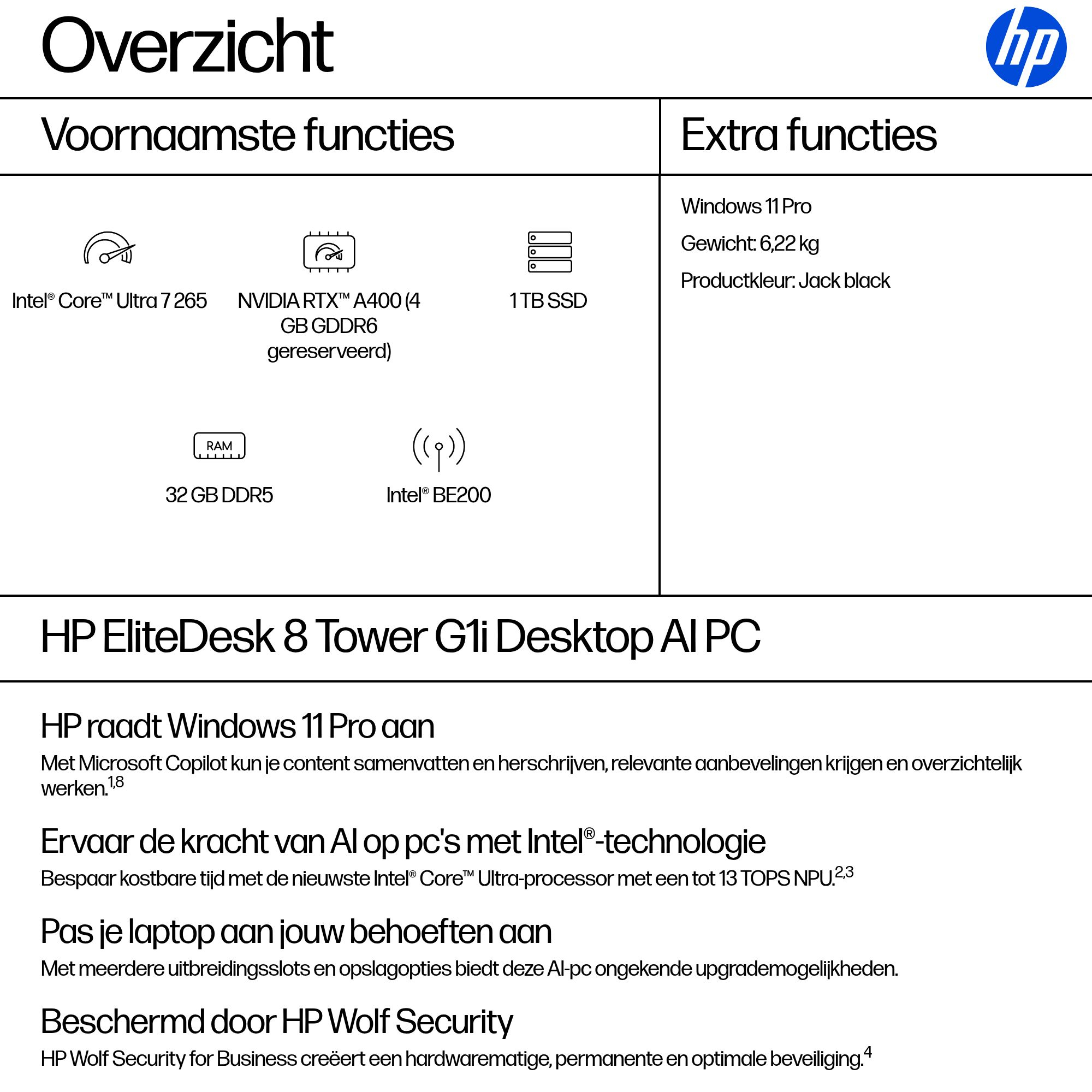 HP EliteDesk 8 TWR G1i U7265 32GB/1TB PC Intel Core Ultra 7 265 DDR5-SDRAM SSD NVIDIA RTX A400 Windows 11 Pro Tower AI PC Zwart