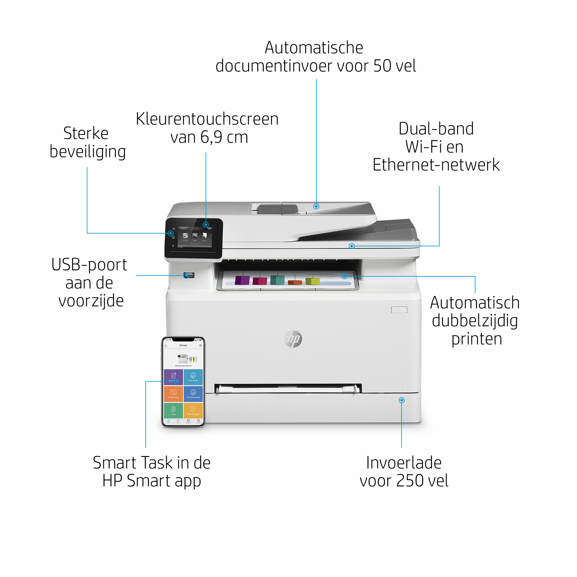 Profiteer van optimale printprestaties met hoogwaardige kleuren, de veelzijdigheid van een MFP en automatisch dubbelzijdig printen.