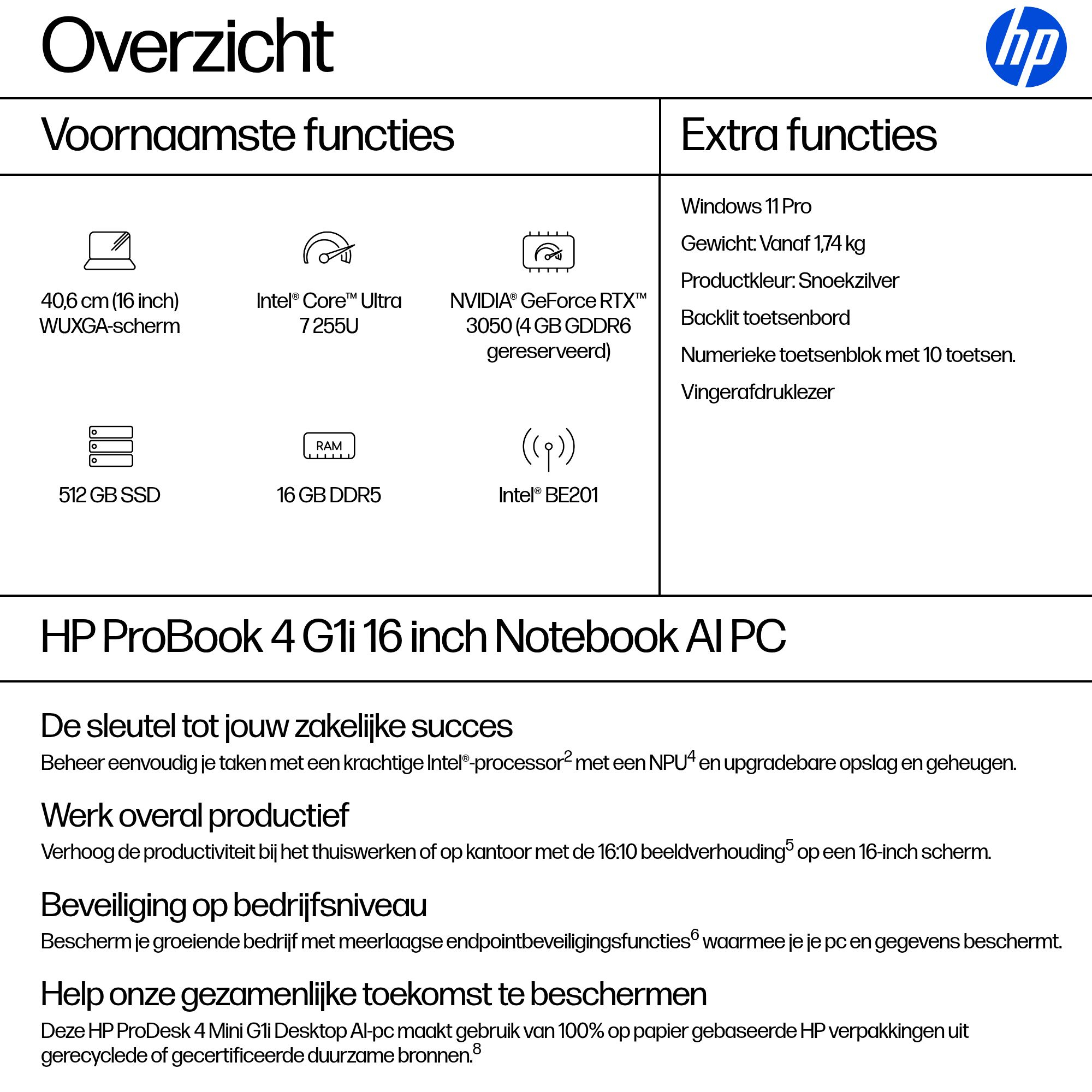 HP ProBook 4 P4G1i16 U7 255U 16 16GB/512 PC NL Intel Core Ultra 7 Laptop 40,6 cm (16") WUXGA DDR5-SDRAM 512 GB SSD Wi-Fi 7 (802.11be) Windows 11 Pro AI PC Zilver