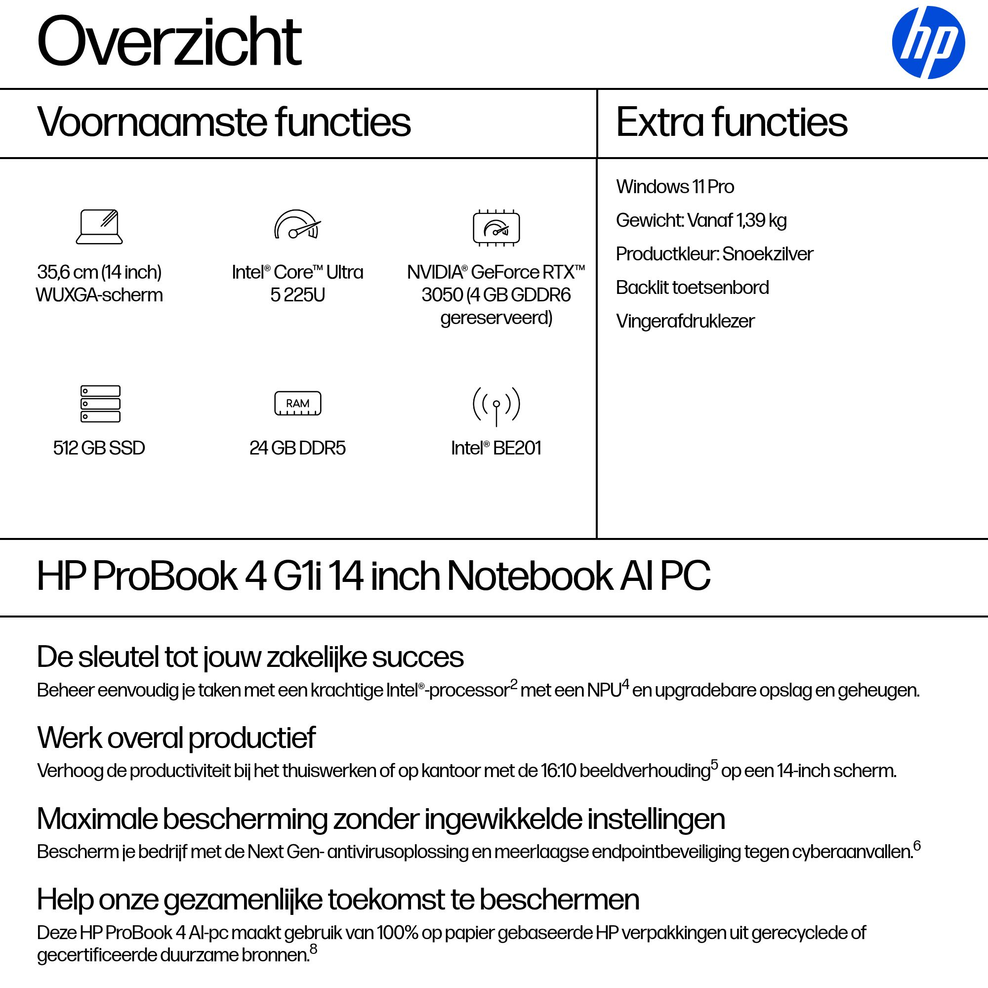 HP ProBook 4 P4G1i14 U5 225U 14 24GB/512 PC NL Intel Core Ultra 5 Laptop 35,6 cm (14") WUXGA DDR5-SDRAM 512 GB SSD Wi-Fi 7 (802.11be) Windows 11 Pro AI PC Zilver