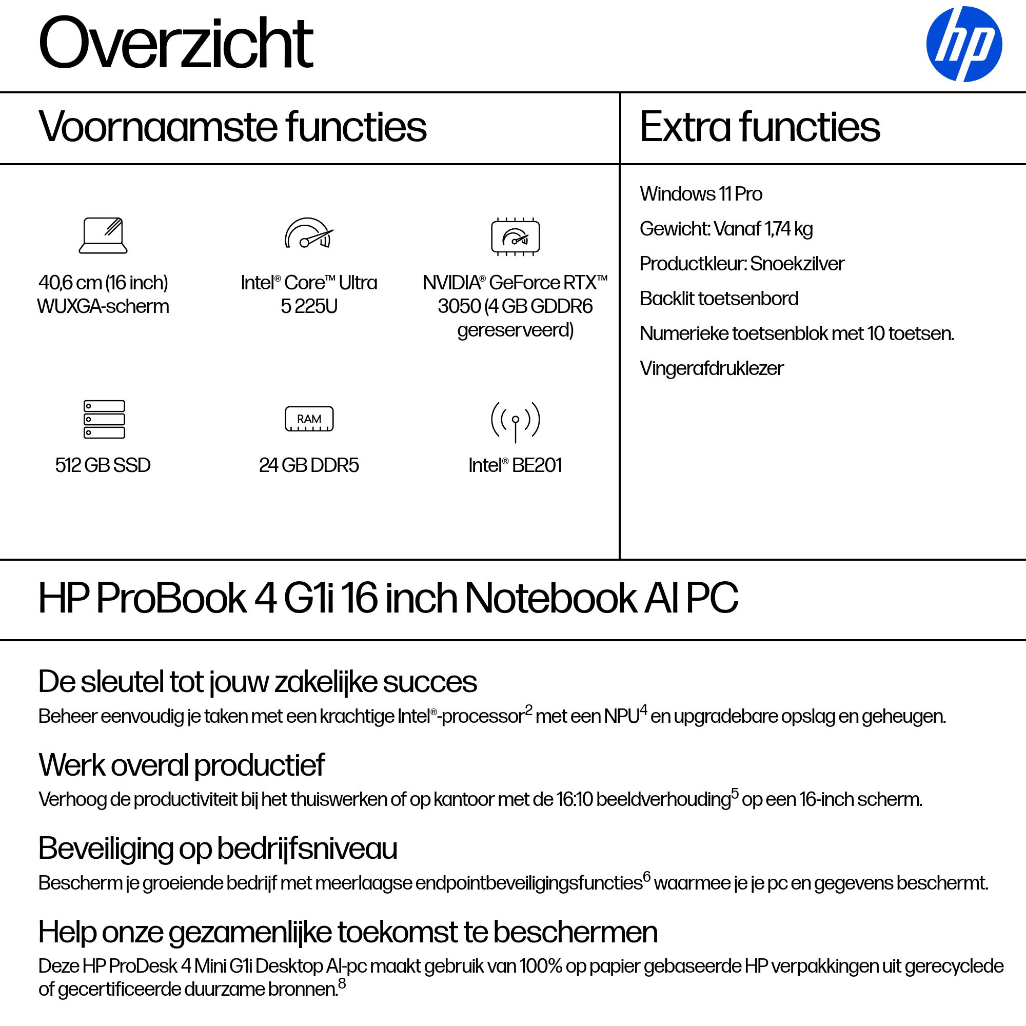 HP ProBook 4 P4G1i16 U5 225U 16 24GB/512 PC Intel Intel Core Ultra 5 Laptop 40,6 cm (16") WUXGA DDR5-SDRAM 512 GB SSD Wi-Fi 7 (802.11be) Windows 11 Pro AI PC Zilver