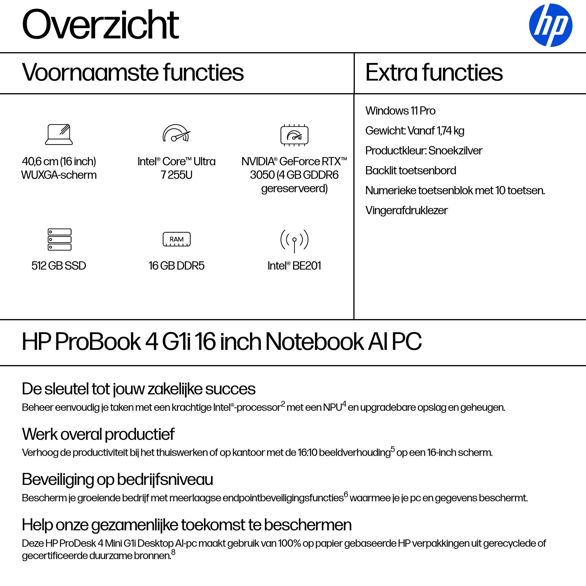 De HP ProBook 4 G1i 16-inch AI-laptop biedt groeiende bedrijven topprestaties, meerlaagse endpointbeveiliging[6] en duurzaamheid in een eenvoudig te upgraden ontwerp. Dankzij de nieuwste Intel-processor[2] met 11 TOPS NPU[4] en lange batterijduur is deze functierijke pc goed uitgerust voor langdurige productiviteit en AI.