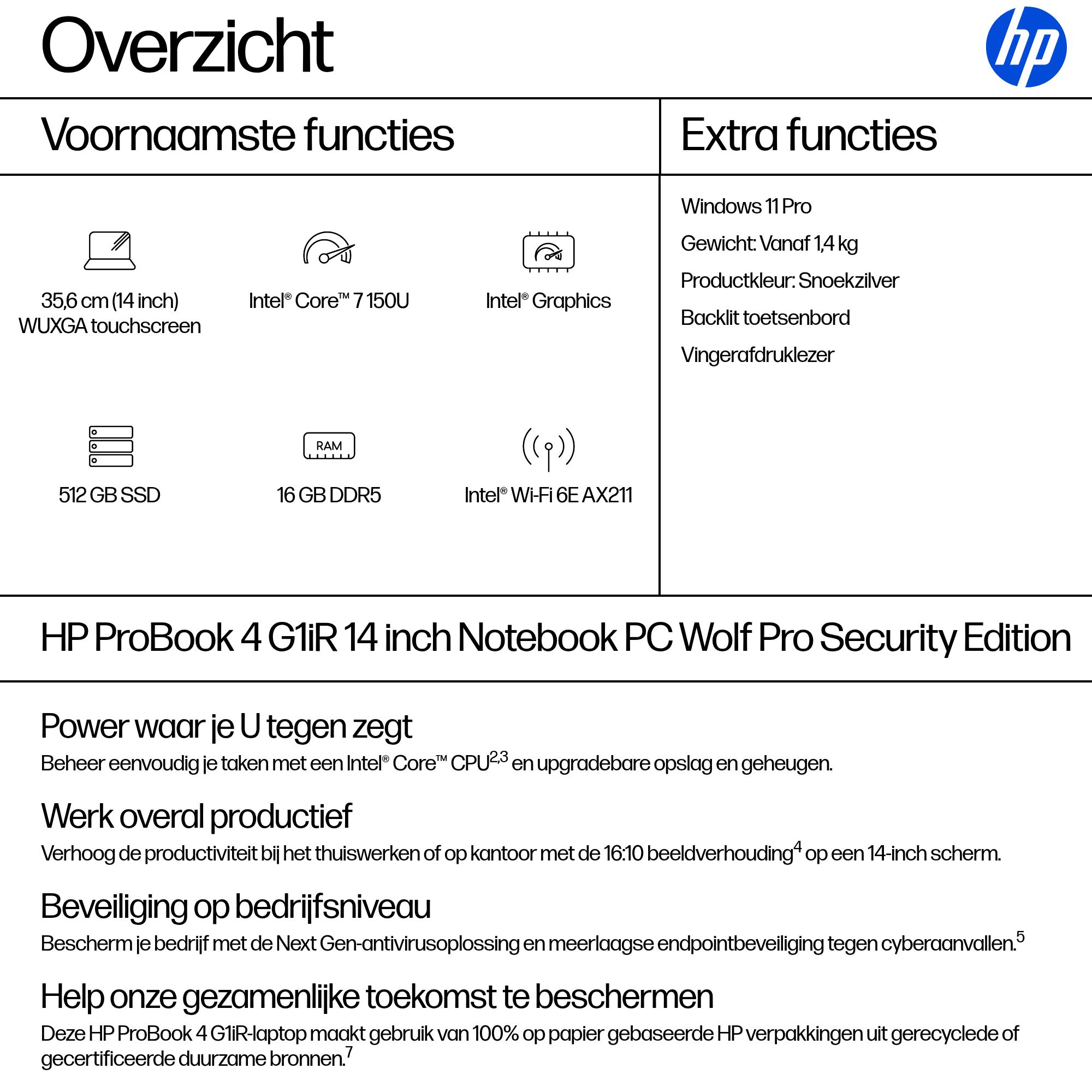 HP ProBook 4 PB4G1iR14 7-150U 14 16GB/512 PC NL Intel Core 7 Laptop 35,6 cm (14") Touchscreen WUXGA DDR5-SDRAM 512 GB SSD Wi-Fi 6E (802.11ax) Windows 11 Pro Zilver