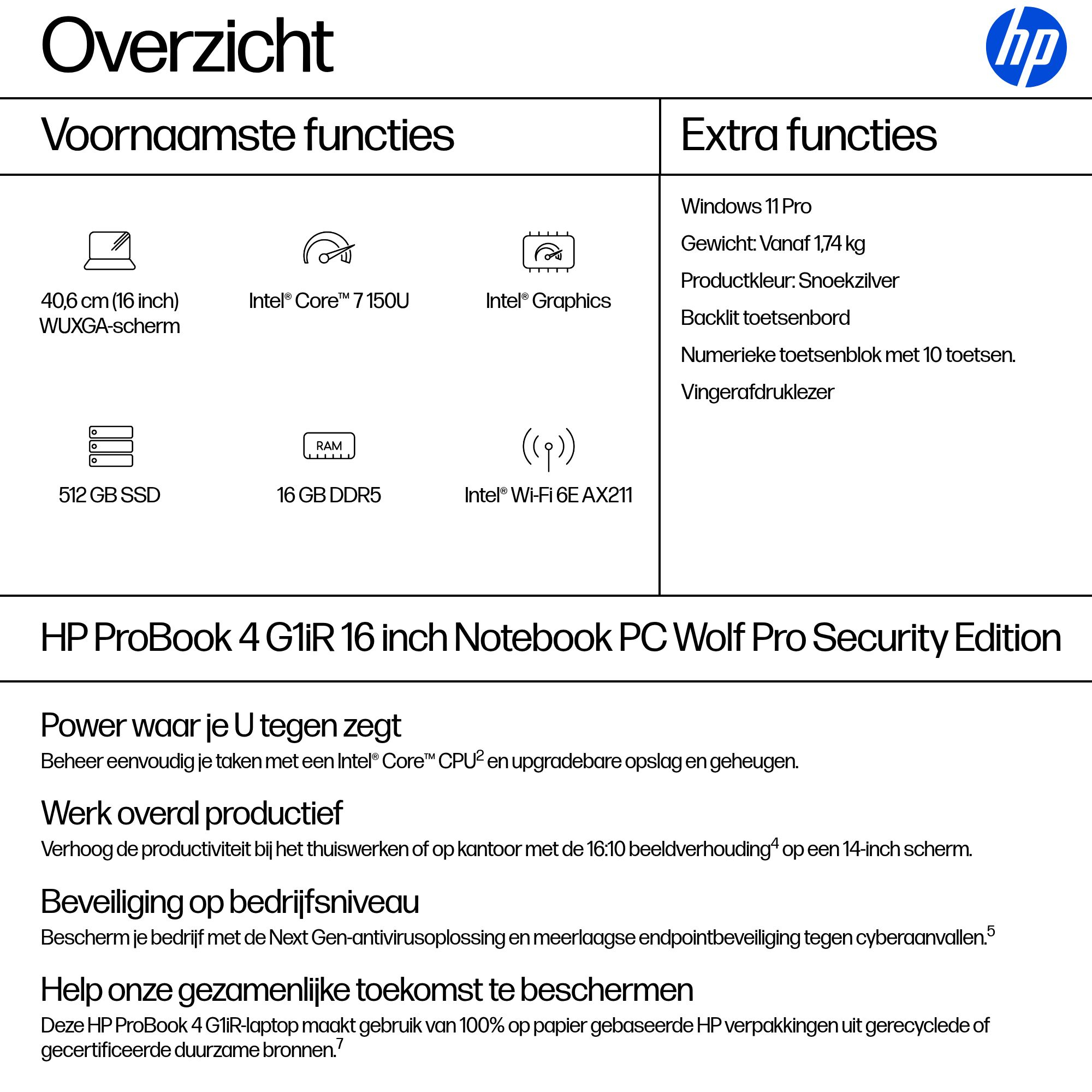HP ProBook 4 PB4G1iR16 7-150U 16 16GB/512 PC NL Intel Core 7 Laptop 40,6 cm (16") WUXGA DDR5-SDRAM 512 GB SSD Wi-Fi 6E (802.11ax) Windows 11 Pro Zilver