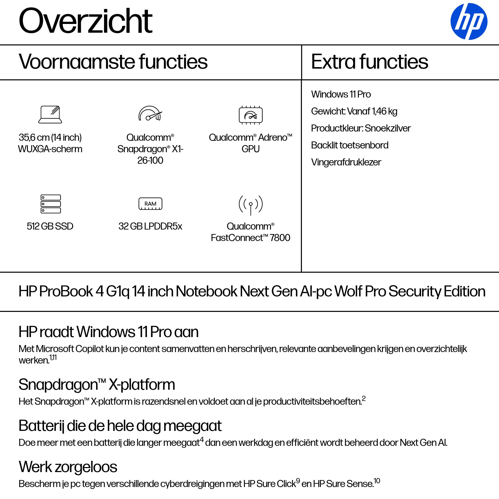 HP ProBook 4 PB4G1q14 X126100 14 32GB/512 PC NL Copilot+ PC Qualcomm Snapdragon X1-26-100 Laptop 35,6 cm (14") WUXGA LPDDR5x-SDRAM 512 GB SSD Wi-Fi 7 (802.11be) Windows 11 Pro Zilver