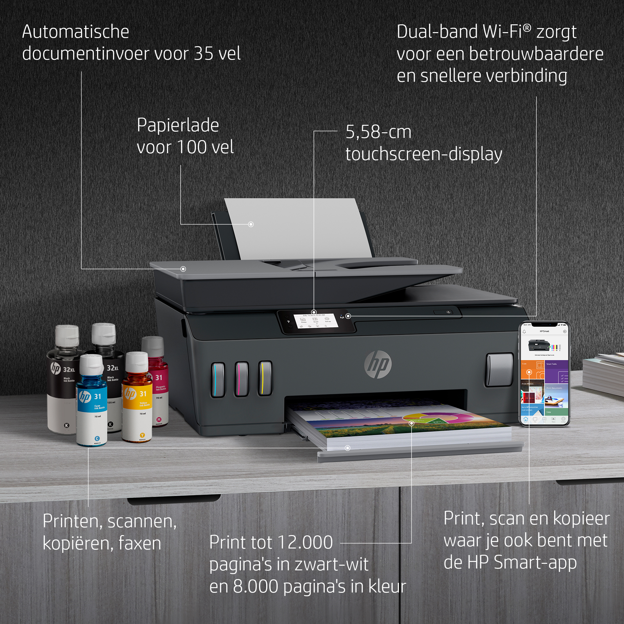 | Inhoud | HP Smart Tank Plus 655 draadloze All-in-One; 2 x HP 32XL originele zwarte inktfles, 135 ml; HP 31 originele cyaan inktfles, 70 ml; HP 31 originele magenta inktfles, 70 ml; HP 31 originele gele inktfles, 70 ml; Flyer met inktwaarschuwingen; Flyer over herverpakking; Installatiegids; Naslaggids; Flyer met regelgeving; PT-flyer; Flyer met RoH-EAC-regelgeving; Netsnoer (kijk voor meer informatie over inhoud en opbrengst op http://www.hp.com/go/learnaboutsupplies) |