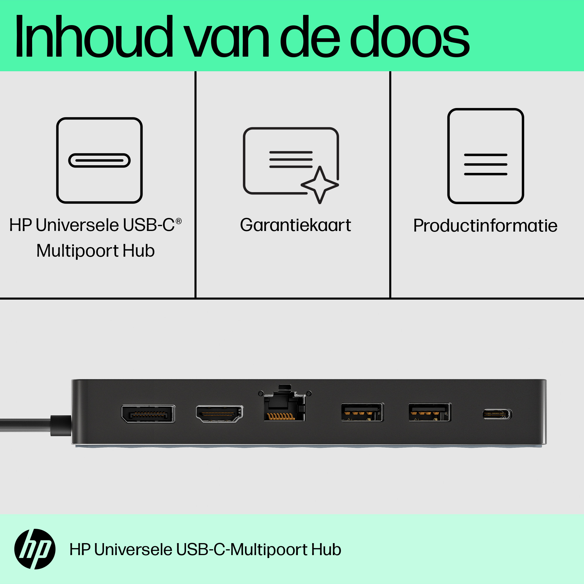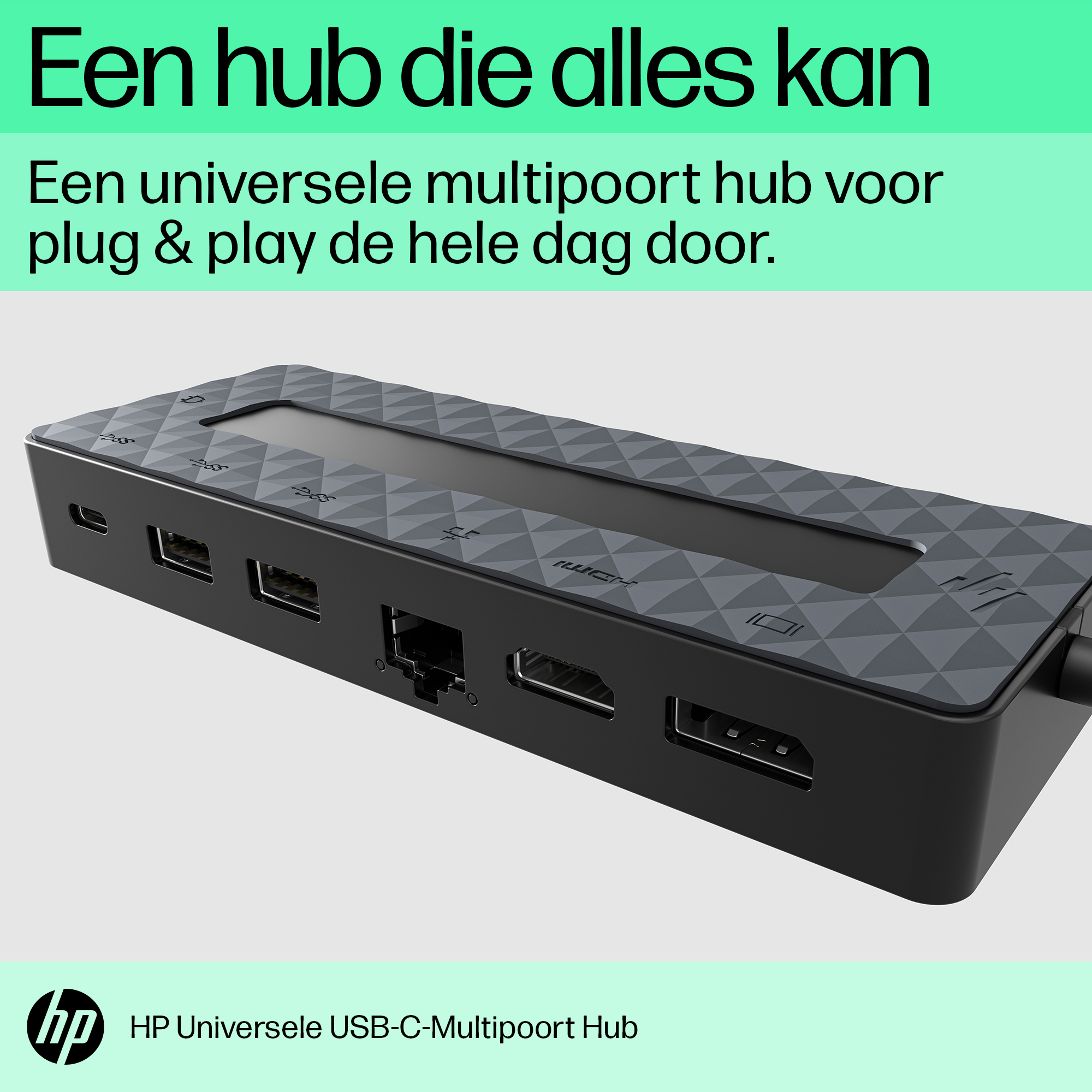 Profiteer van de nieuwe mogelijkheden met de HP Universal USB-C Multiport hub, die nu elke met USB-C[1] compatibele pc ondersteunt. 7 poorten, 1 stroom- en datadoorvoerkabel, en veel randapparatuur om via plug-en-play aan te sluiten. Hij ondersteunt ook twee 4K-beeldschermen[2] via HDMI 2.0 en 1 DisplayPort™ 1.2. Deze hub is alles wat je nodig hebt om verbonden te blijven.