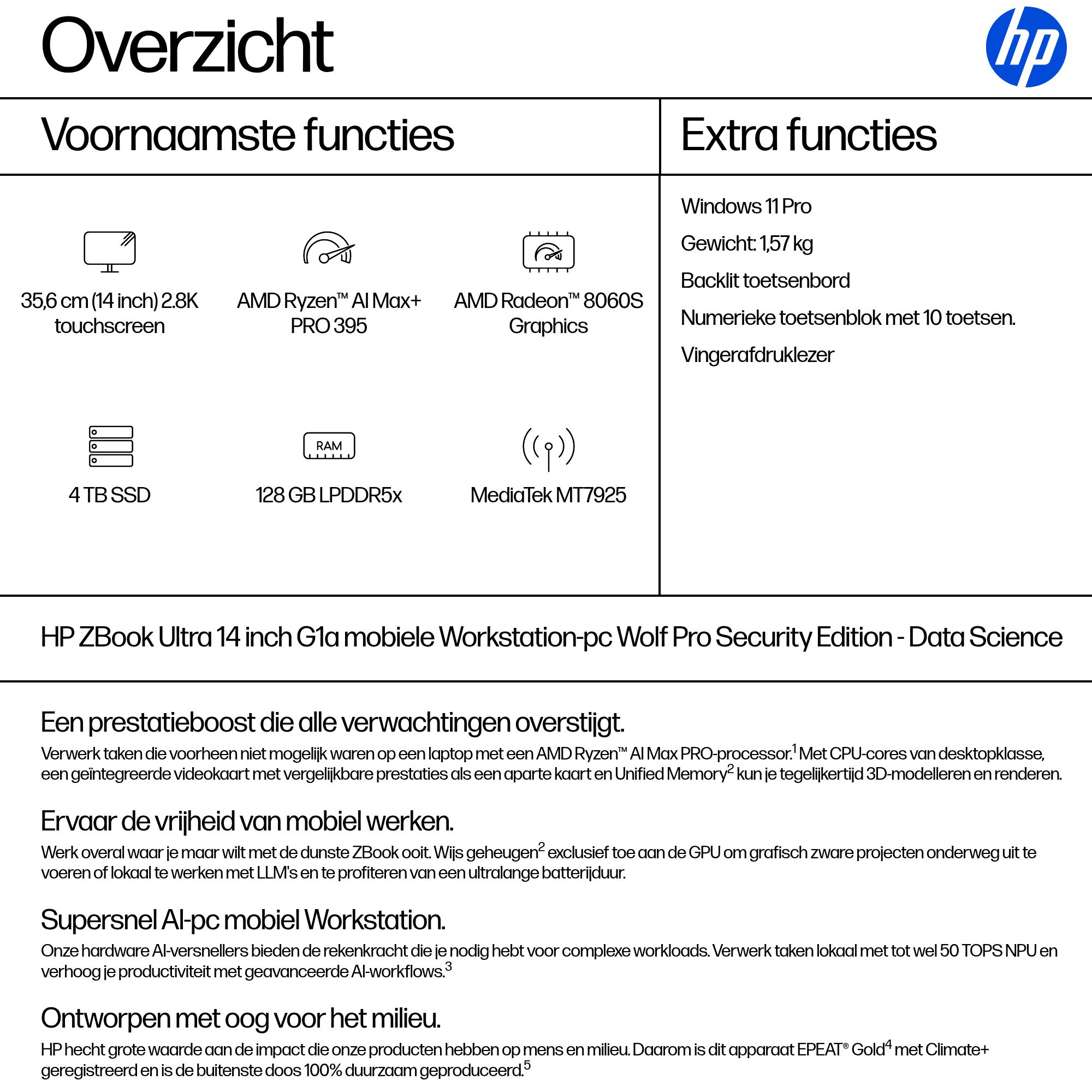 HP ZBook Ultra 14 inch G1a Mobile Workstation PC Wolf Pro Security Edition - Data Science Copilot+ PC AMD Ryzen AI Max+ PRO 395 Mobiel werkstation 35,6 cm (14") Touchscreen 2.8K 128 GB LPDDR5x-SDRAM 4 TB SSD Wi-Fi 7 (802.11be) Windows 11 Pro AI Workstatio