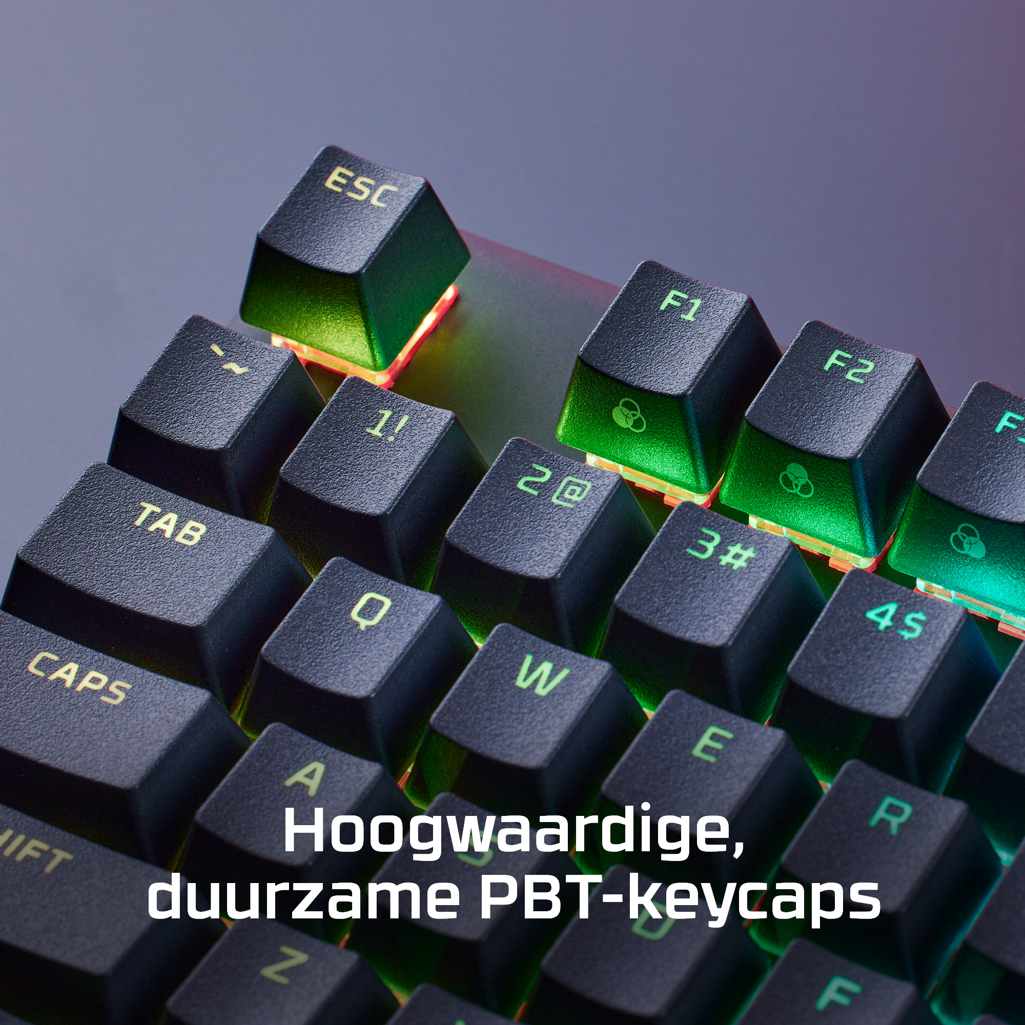 Deze duurzame PBT-keycaps met reliëf zijn ook aan de zijkant bedrukt, zodat dit niet in contact komt met het materiaal en de leesbaarheid op lange termijn gewaarborgd blijft.