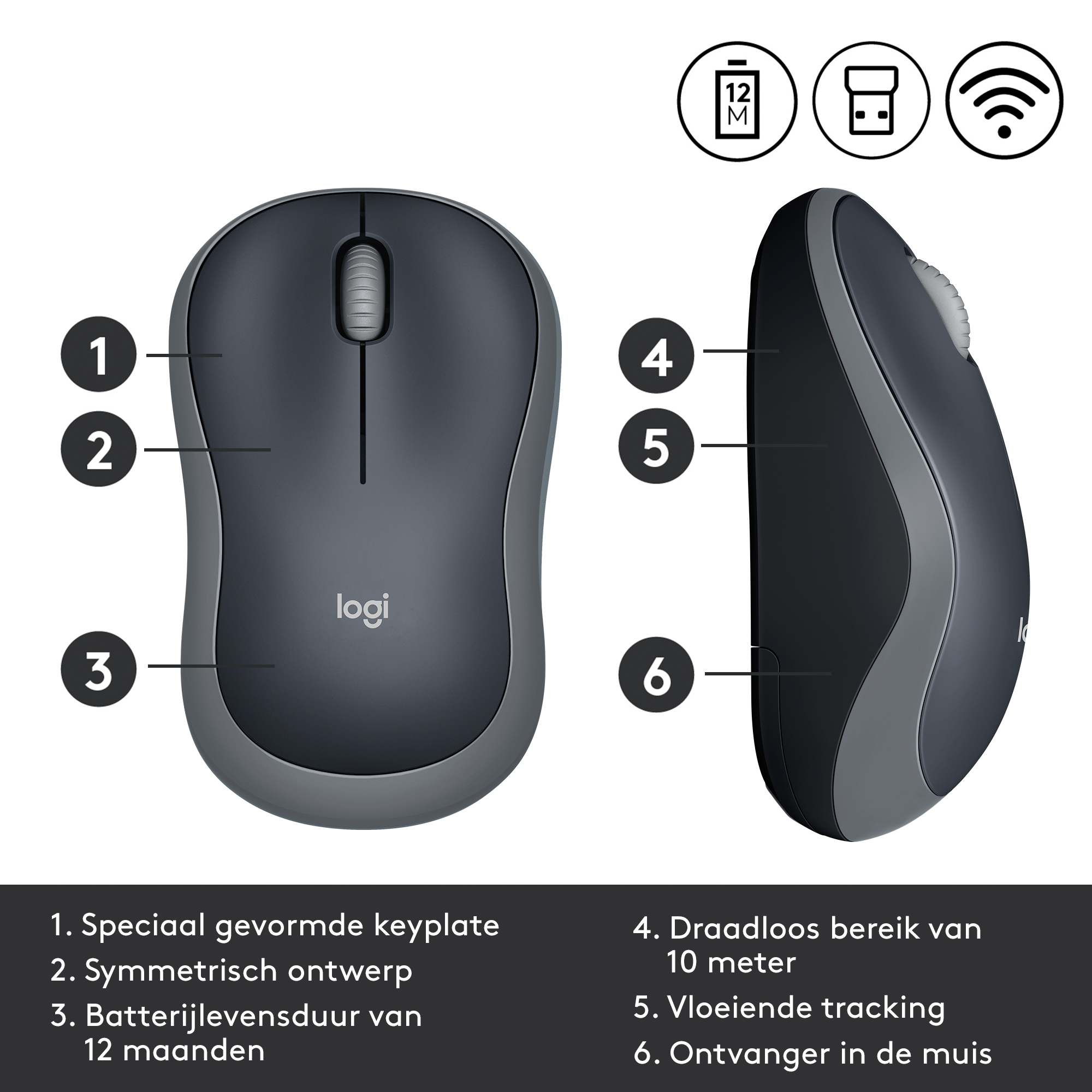 Blijf langer productief met de comfortabele, geronde vorm die de natuurlijke vorm van uw hand volgt. De muis is compact en draadloos en past eenvoudig met uw laptop in een tas, zodat u deze overal mee naartoe kunt nemen. De M185 is ontworpen om zowel voor rechts- als linkshandigen even comfortabel te zijn.