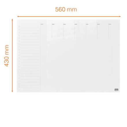 Nobo 1915602. Working area: 430 x 560 mm, Oppervlaktekleur: Glas, Kleur van het product: Wit. Breedte: 430 mm, Diepte: 8 mm, Hoogte: 560 mm