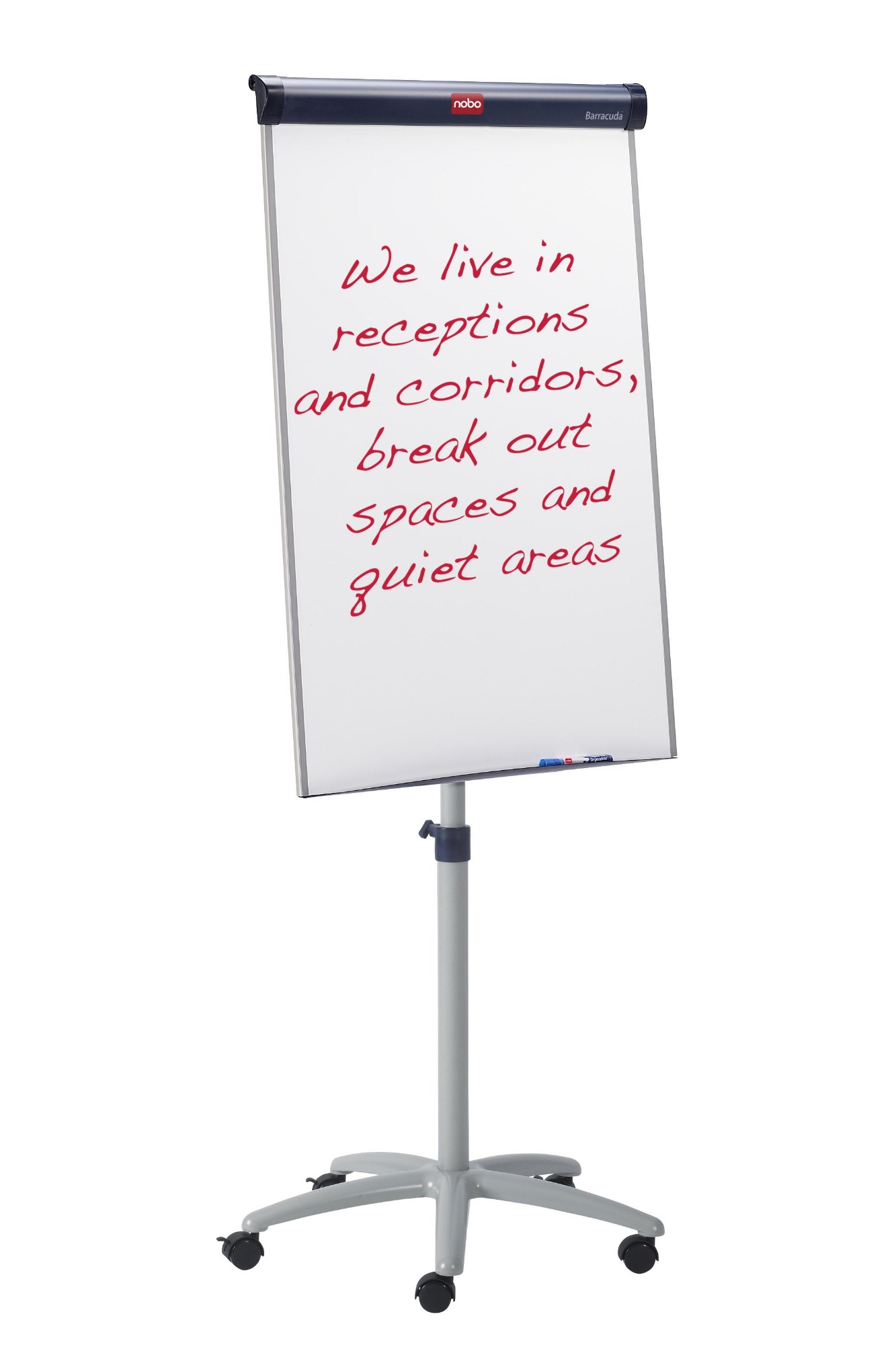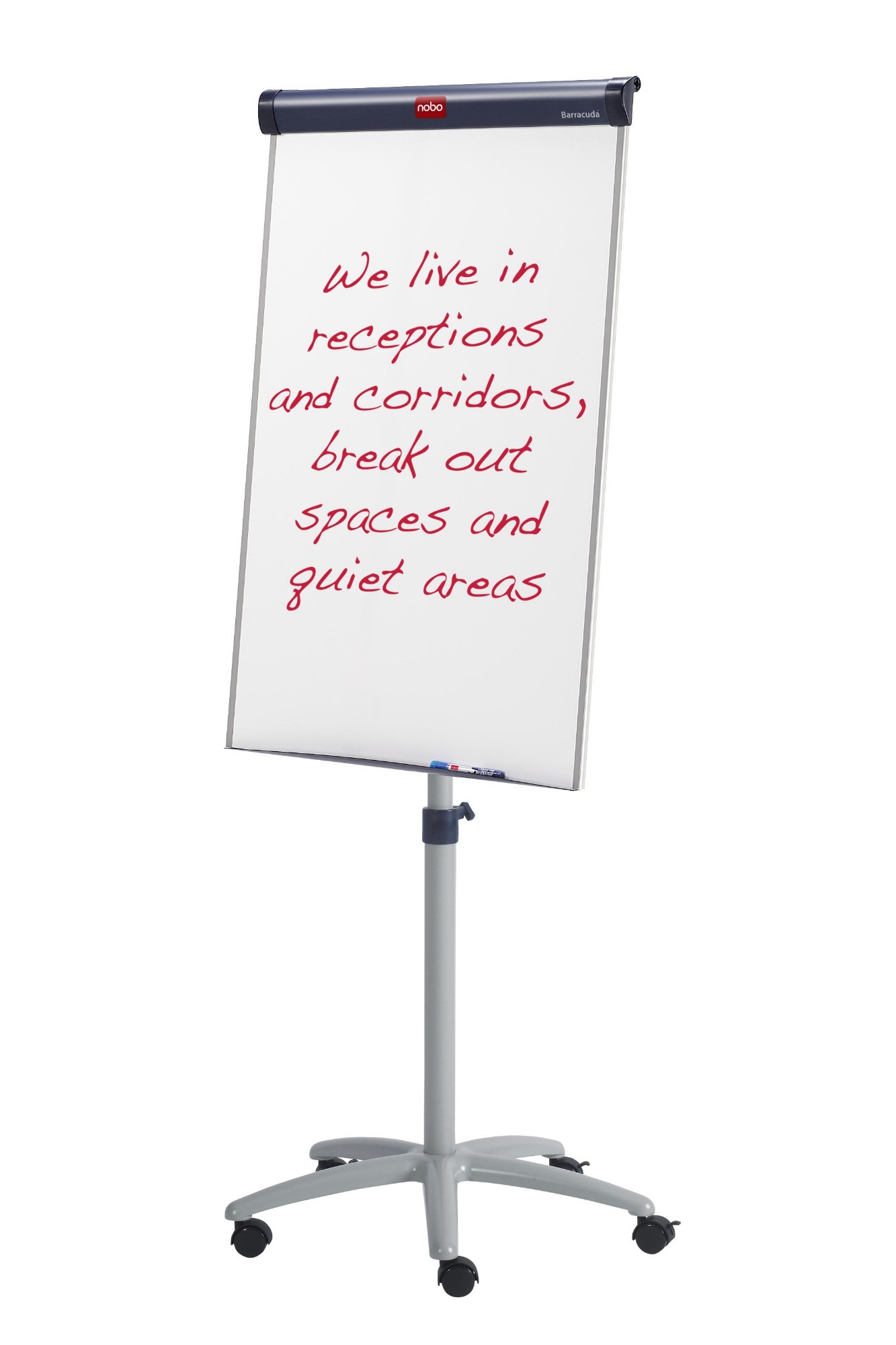 De mobiele magnetische Barracuda flipover is in hoogte verstelbaar en door de zwenkwielen goed verplaatsbaar. Tijdens gebruik vergrendelt u 3 wielen voor de stabiliteit. Dankzij de papierklem is papier wisselen eenvoudig en met de verstelbare papiergrijpers past bijna elk formaat flipoverblok. Zonder papier is de Barracuda te gebruiken als whiteboard.