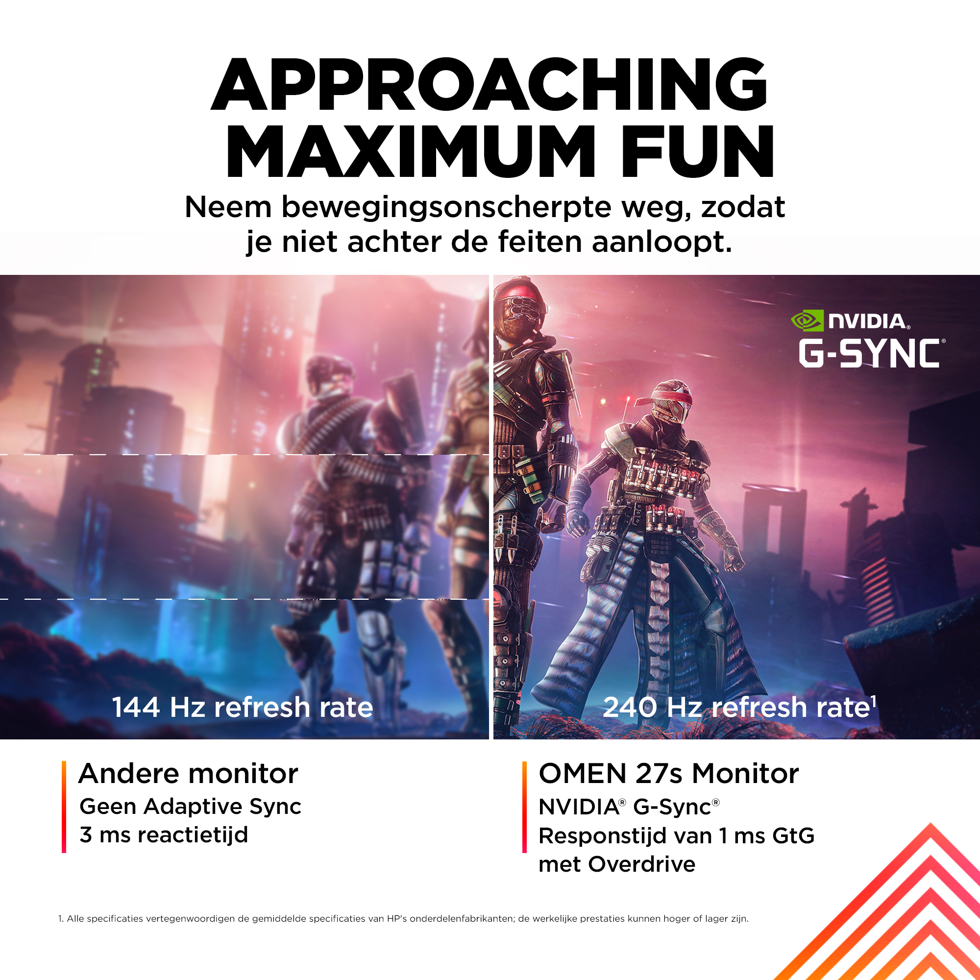 Overtref je tegenstanders met de OMEN by HP 27 inch FHD 240 Hz gamingmonitor. Deze NVIDIA G-SYNC-compatibele monitor levert ultrasoepele frames en haarscherpe details[1] en heeft alles in huis om jou bij te houden. Een combinatie van snelheid en uiterlijk met een leuk, verfijnd ontwerp als geen ander, zodat je er in de game en daarbuiten van kunt genieten.