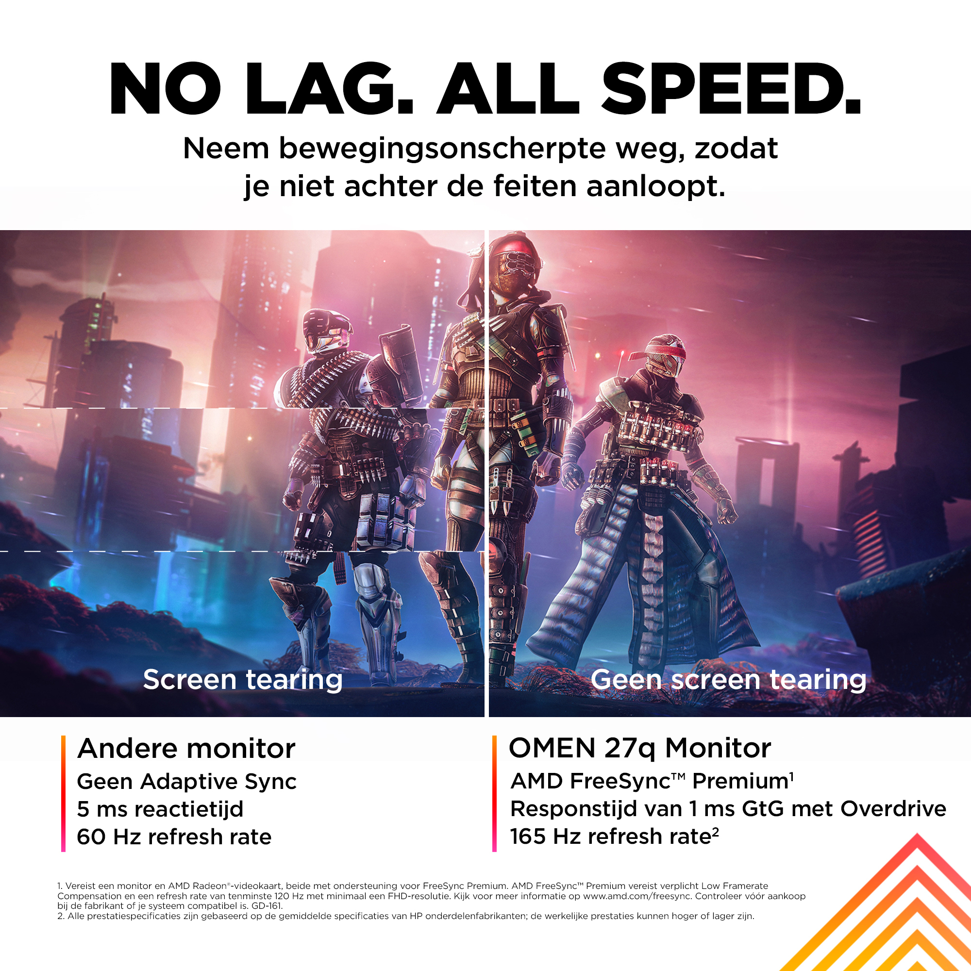 Ervaar frame voor frame alle actie, zonder afleidingen. Voor soepele beelden zonder onscherpe bewegingen<sup>[1]</sup> heeft dit scherm een hoge refresh rate van 165 Hz en een GTG-responstijd van 1 ms met Overdrive, zodat je in elke pixel wordt bijgehouden. Stilstaande schermen en vertragingen zijn verleden tijd dankzij AMD FreeSync™ Premium-technologie<sup>[2]</sup>.