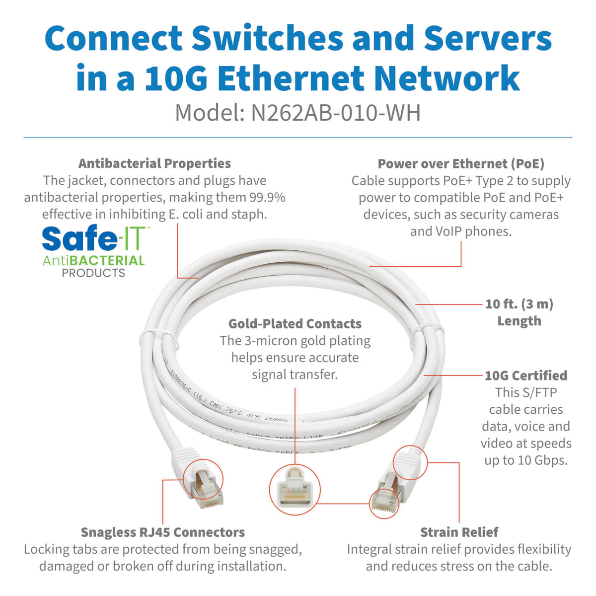 Tripp Lite N262AB-010-WH. Snoerlengte: 3,05 m, Kabel standaard: Cat6a, Kabelafscherming: S/FTP (S-STP), Aansluiting 1: RJ-45, Aansluiting 2: RJ-45, Contact geleider materiaal: Goud, Overdrachtssnelheid: 10000 Mbit/s, Kleur van het product: Wit