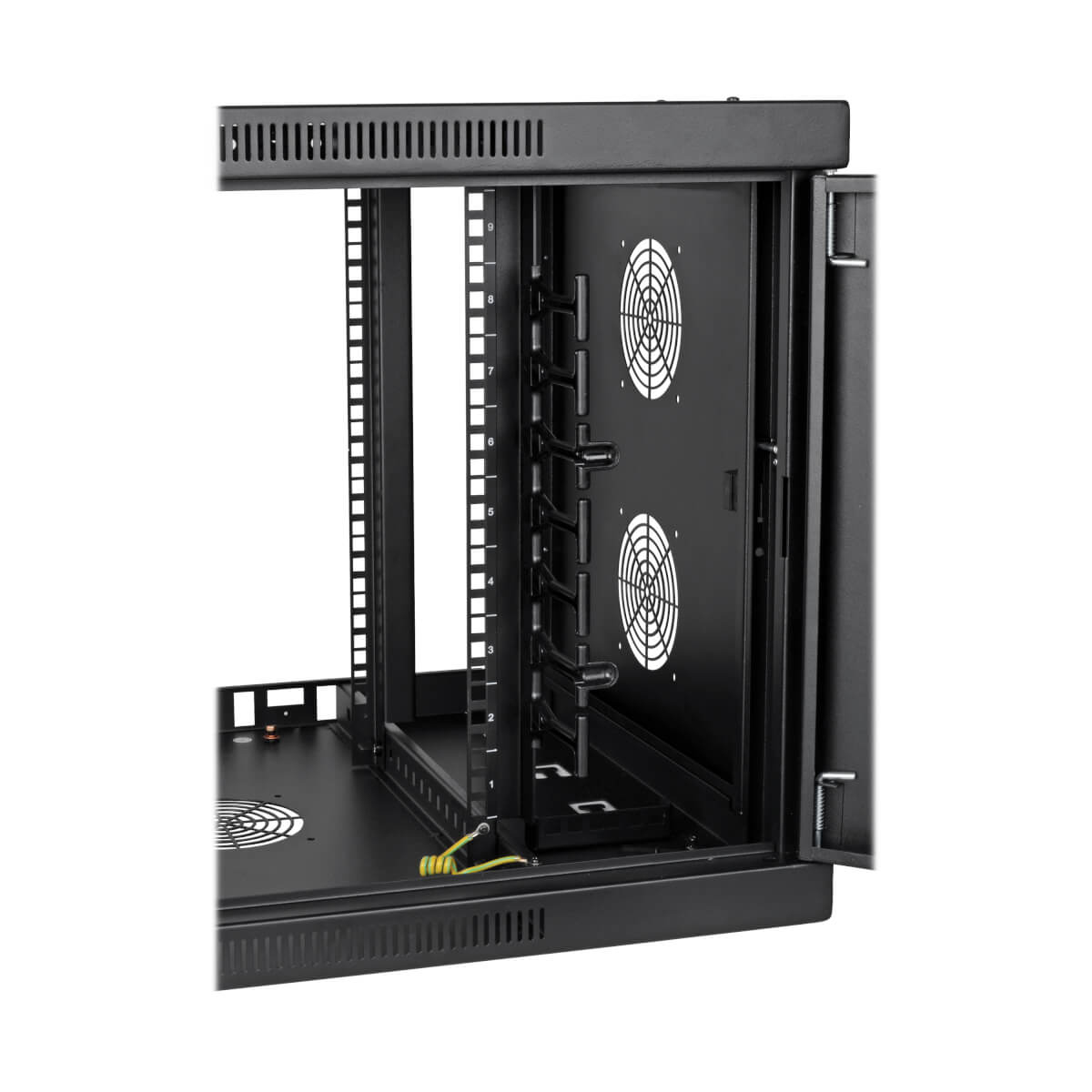 Tripp Lite SRW9UDPVRT. Soort: Wandrek, Rackcapaciteit: 9U, Maximale gewichtscapaciteit: 91 kg, Sleutelsleuf, Verbeterd kabelbeheer, Internationale veiligheidscode (IP): IP20. Gewicht: 23,5 kg. Kleur van het product: Zwart