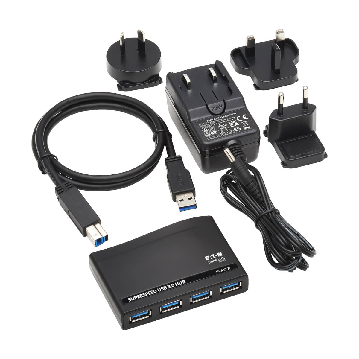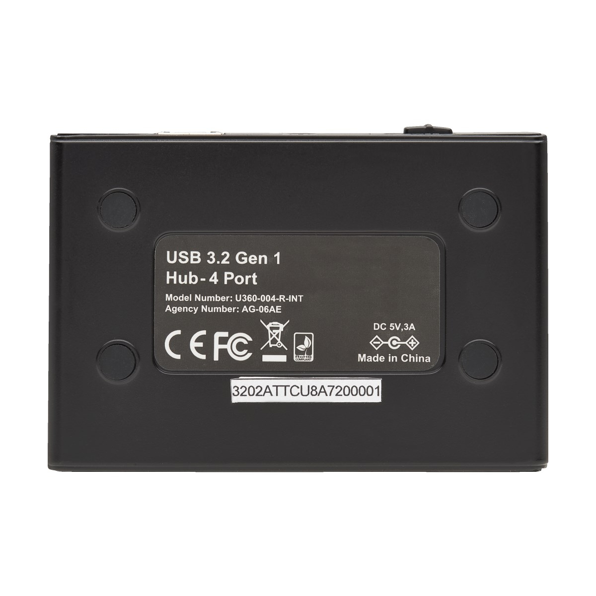 Tripp Lite U360-004-R-INT. Hostinterface: USB 3.2 Gen 1 (3.1 Gen 1) Type-B, Hub-interfaces: USB 3.2 Gen 1 (3.1 Gen 1) Type-A. Overdrachtssnelheid: 5000 Mbit/s, Kleur van het product: Zwart, Materiaal behuizing: Acrylonitrielbutadieenstyreen (ABS). Soort voeding: AC, Ingangsspanning: 100 - 240 V, Stroom: 0.6 A. Breedte: 58,4 mm, Diepte: 22,4 mm, Hoogte: 86,3 mm. Aantal per verpakking: 1 stuk(s), Breedte verpakking: 116,8 mm, Diepte verpakking: 139,7 mm