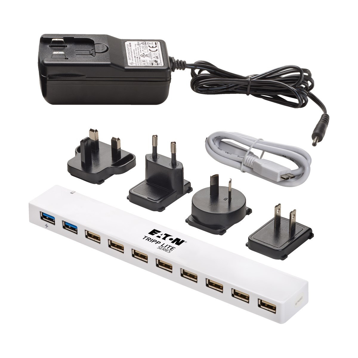 Tripp Lite U360-010C-2X3. Hostinterface: USB 3.2 Gen 1 (3.1 Gen 1) Micro-B, Hub-interfaces: USB 2.0, USB 3.2 Gen 1 (3.1 Gen 1) Type-A. Overdrachtssnelheid: 5000 Mbit/s, Kleur van het product: Wit, Materiaal behuizing: Acrylonitrielbutadieenstyreen (ABS). Ingangsspanning: 100 - 240 V, Stroom: 1.5 A, AC-ingangsfrequentie: 50 - 60 Hz. Gewicht: 80 g. Breedte verpakking: 190 mm, Diepte verpakking: 80 mm, Hoogte verpakking: 55,1 mm