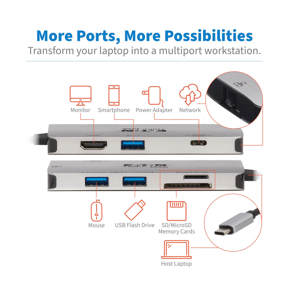 Tripp Lite U442-DOCK5-GY. Connectiviteitstechnologie: Bedraad, Hostinterface: USB 3.2 Gen 1 (3.1 Gen 1) Type-C, USB Power Delivery tot max.: 100 W. Ethernet LAN, data-overdrachtsnelheden: 10,100,1000 Mbit/s, Netwerkstandaard: IEEE 802.3, IEEE 802.3az, IEEE 802.3u, IEEE 802.3x. Kleur van het product: Grijs, Compatibele geheugenkaarten: MicroSD (TransFlash), SD, Overdrachtssnelheid: 5 Gbit/s. Type stroombron: USB, Netstekker: USB Type-C. Breedte: 105 mm, Diepte: 49 mm, Hoogte: 13 mm